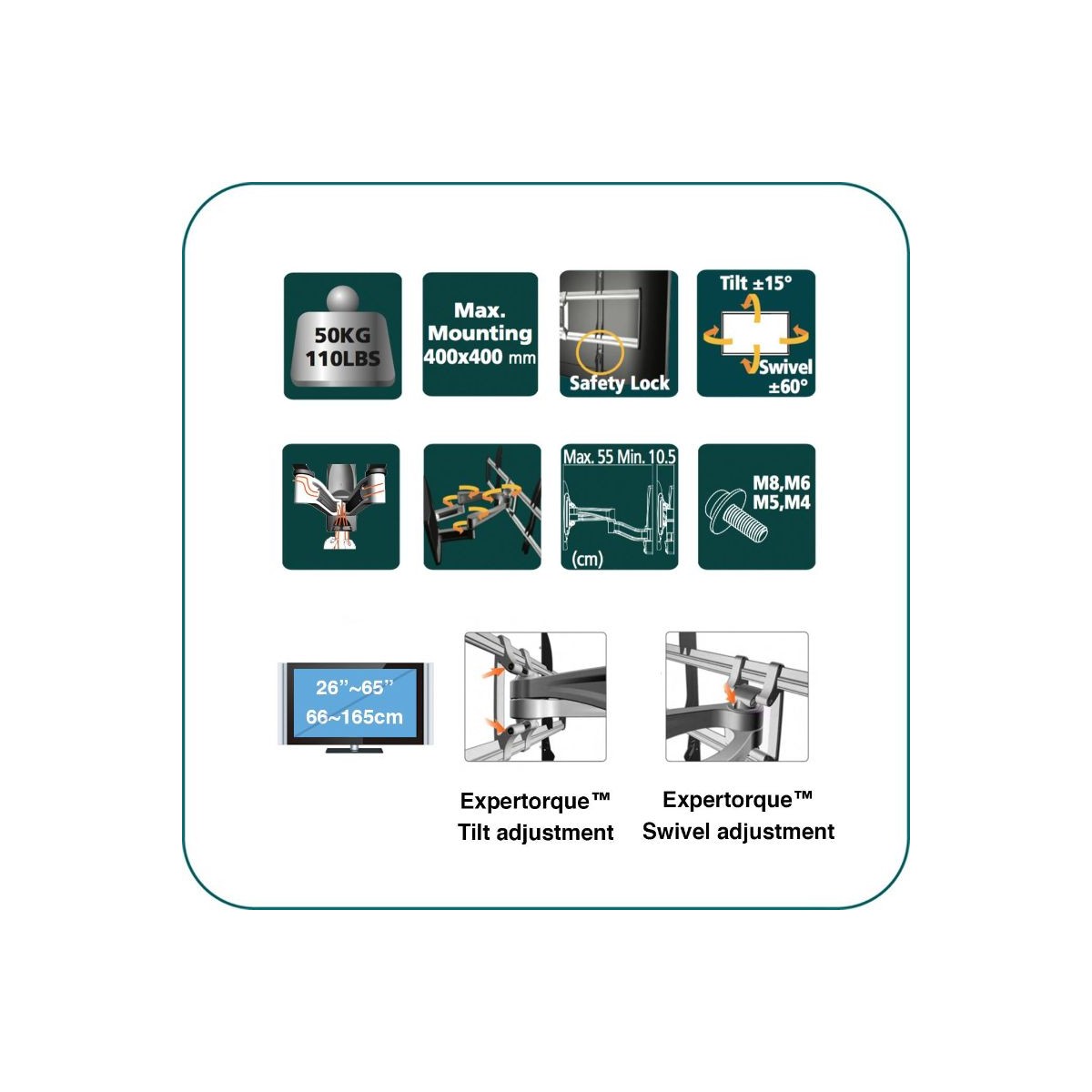 With the Tilt angle of +/-15 degree and swivel +/- 60 degree, it gives you the best viewing angles for screens. It supports max. mounting 400x400mm display and ExperTorque™ technology enables adjustment of the screens hinged by its weight.