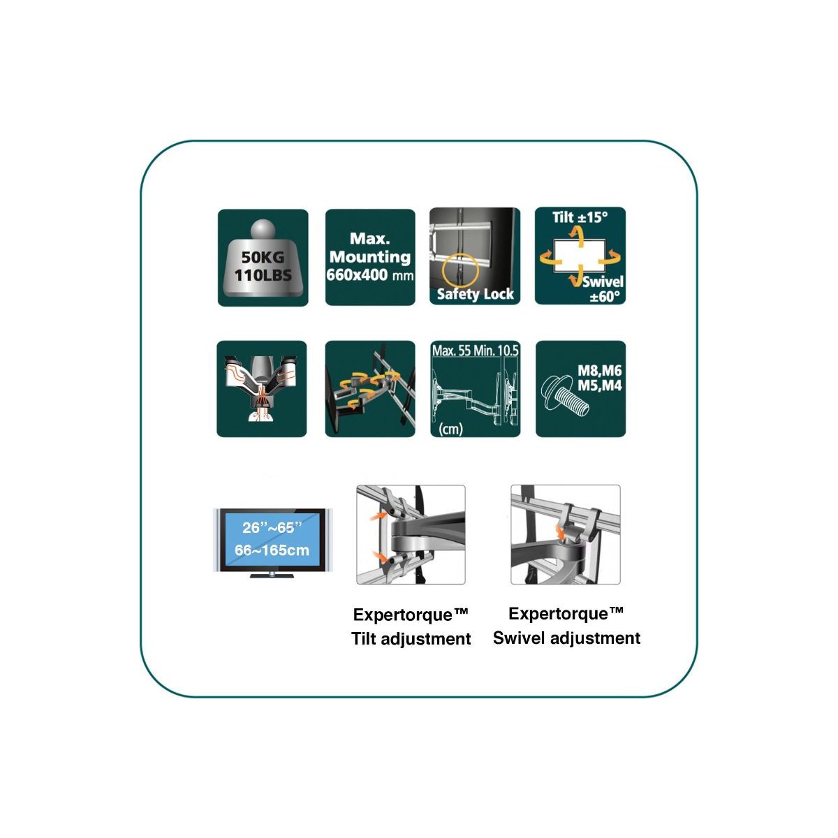 • Flat Panel Size: 26~65 inch/ 66~165cm