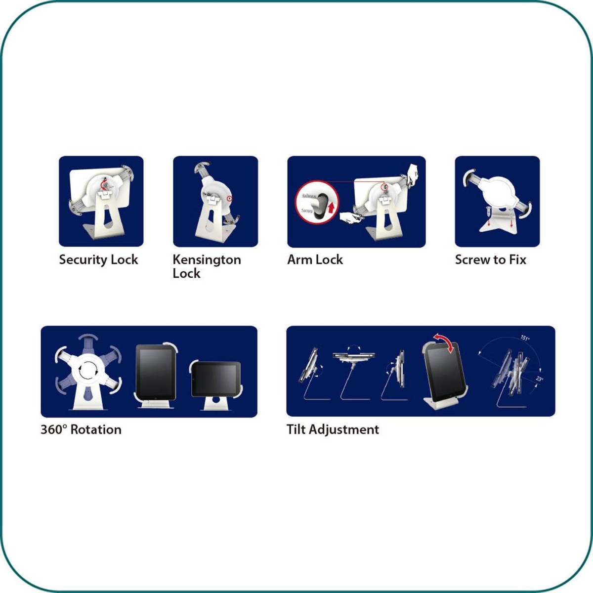 It features the Tri-security mechanism 1). Arm Lock 2). Anti-Thief Lock 3). Kensington Lock. 100% secure Tablet in place as well as the Tablet Holder itself. Holder tilt -23°~+151° for Ideal viewing angle, 360° Rotation for vertical and horizontal placement and Smart Cable Management System to keep cables in good order.
