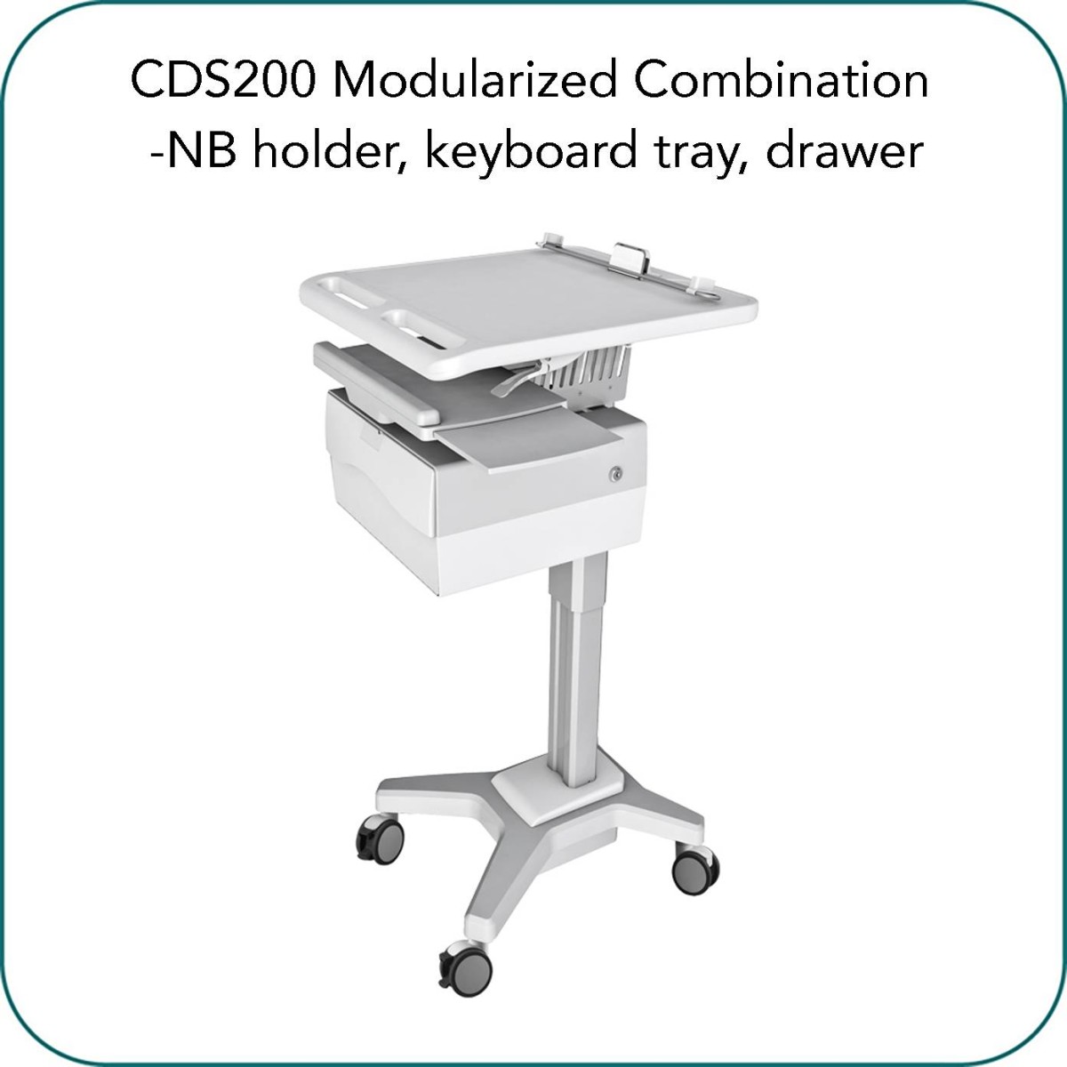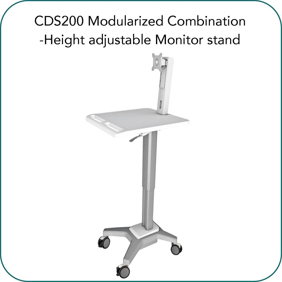 Product code:Aavara CDS200 is Simplified Mobile Computer Cart cart, featuring modularized combination with optional accessory based on what you exactly like to install. It comes in CPU Holder/ Notebook Holder/ Keyboard Tray/ Lockable Medication Drawer and Height adjustable Monitor stand module. It designed with a manual lift to adjust the heights and working surface.
