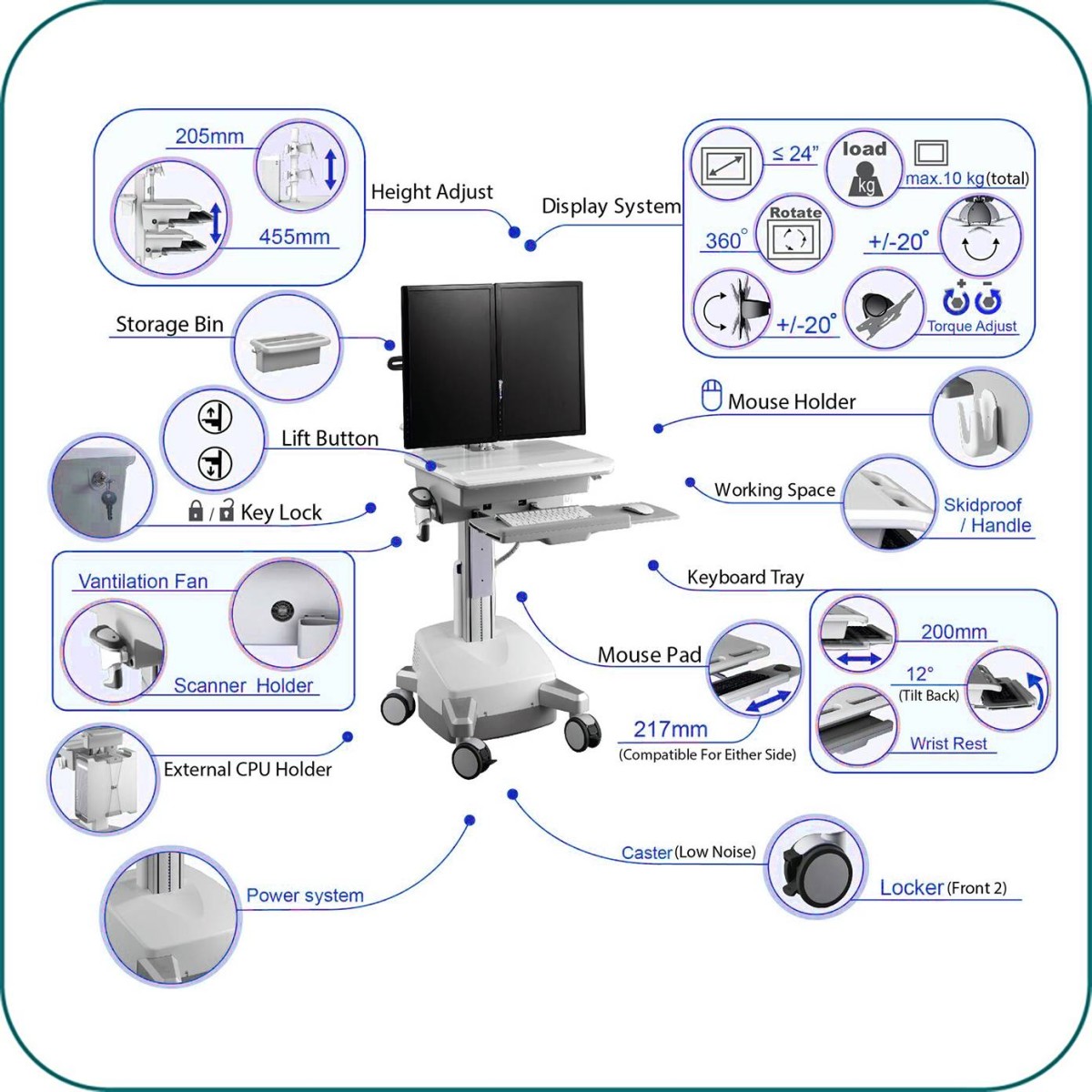 Product code:Aavara is pround to present the Powered Mobile Medical cart series. CED01 is equipped with battery, UPS Charger and E-LIFT for max. efficiency in Healthcare environment.