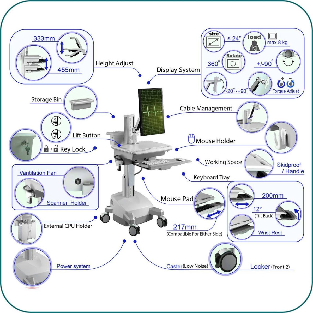 Product code:Aavara is pround to present the Powered Mobile Medical cart series. CER01 is equipped with battery, UPS Charger and E-LIFT for max. efficiency in Healthcare environment.