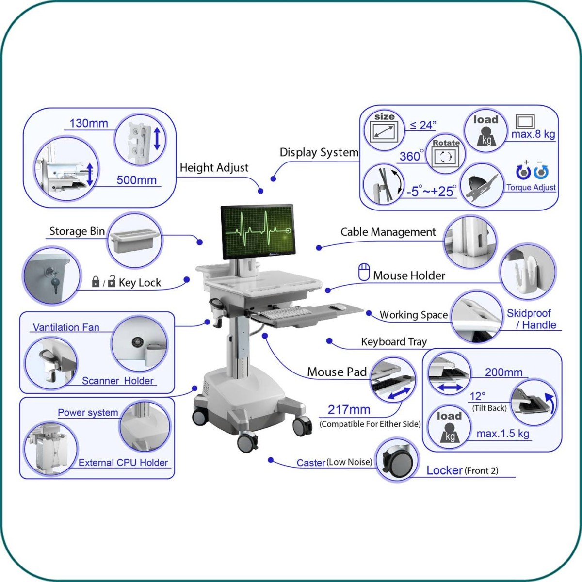 Aavara CMH01 Powered Mobile Medical Cart with Manual LIFT - Single Monitor with height adjustment Type