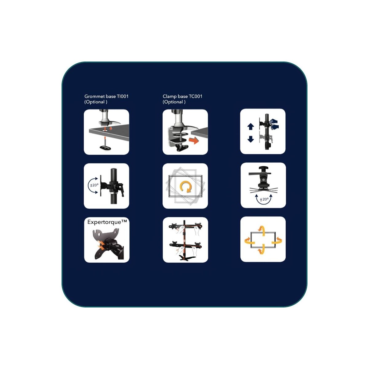 • ExperTorque™ design for easy adjustment hinged by monitor weight