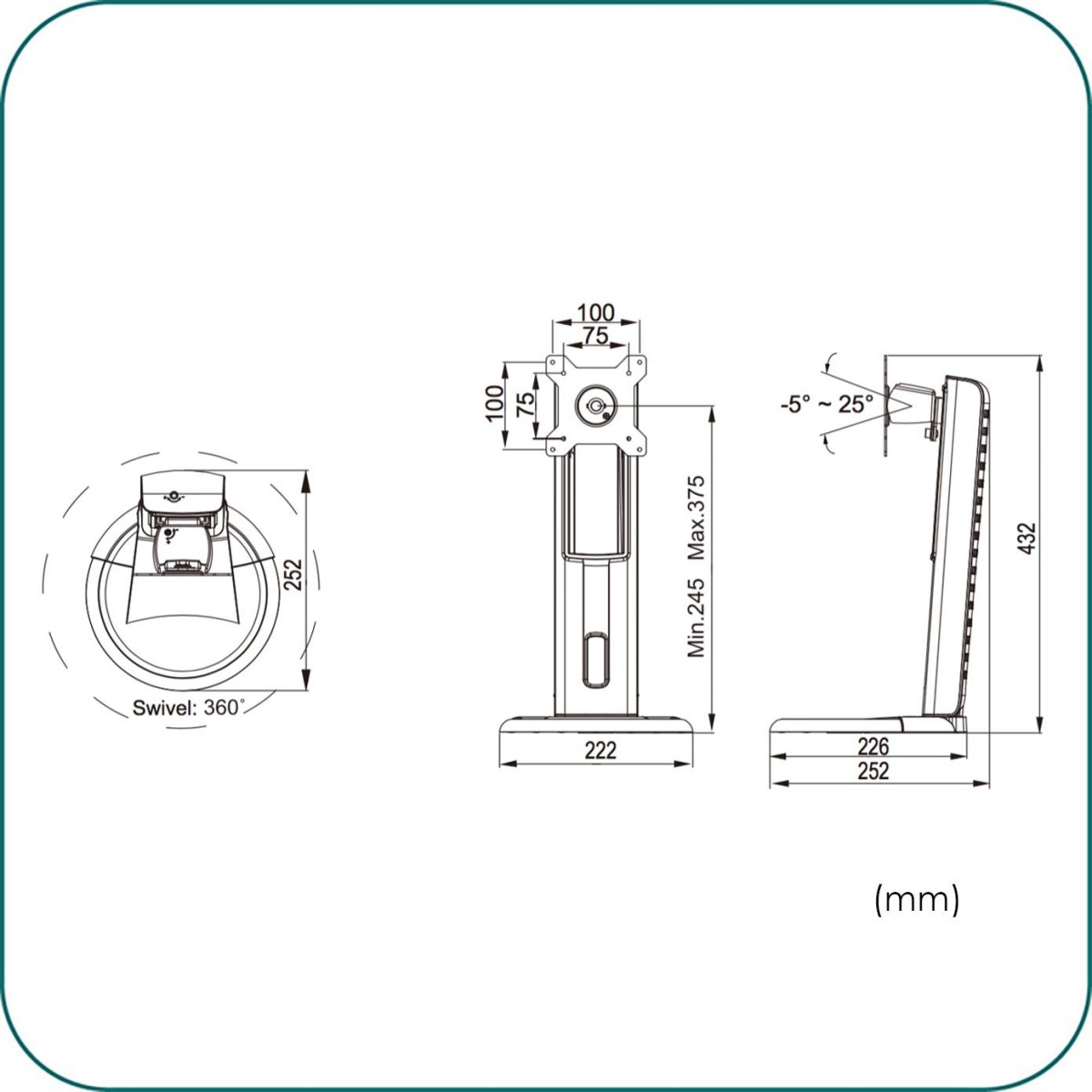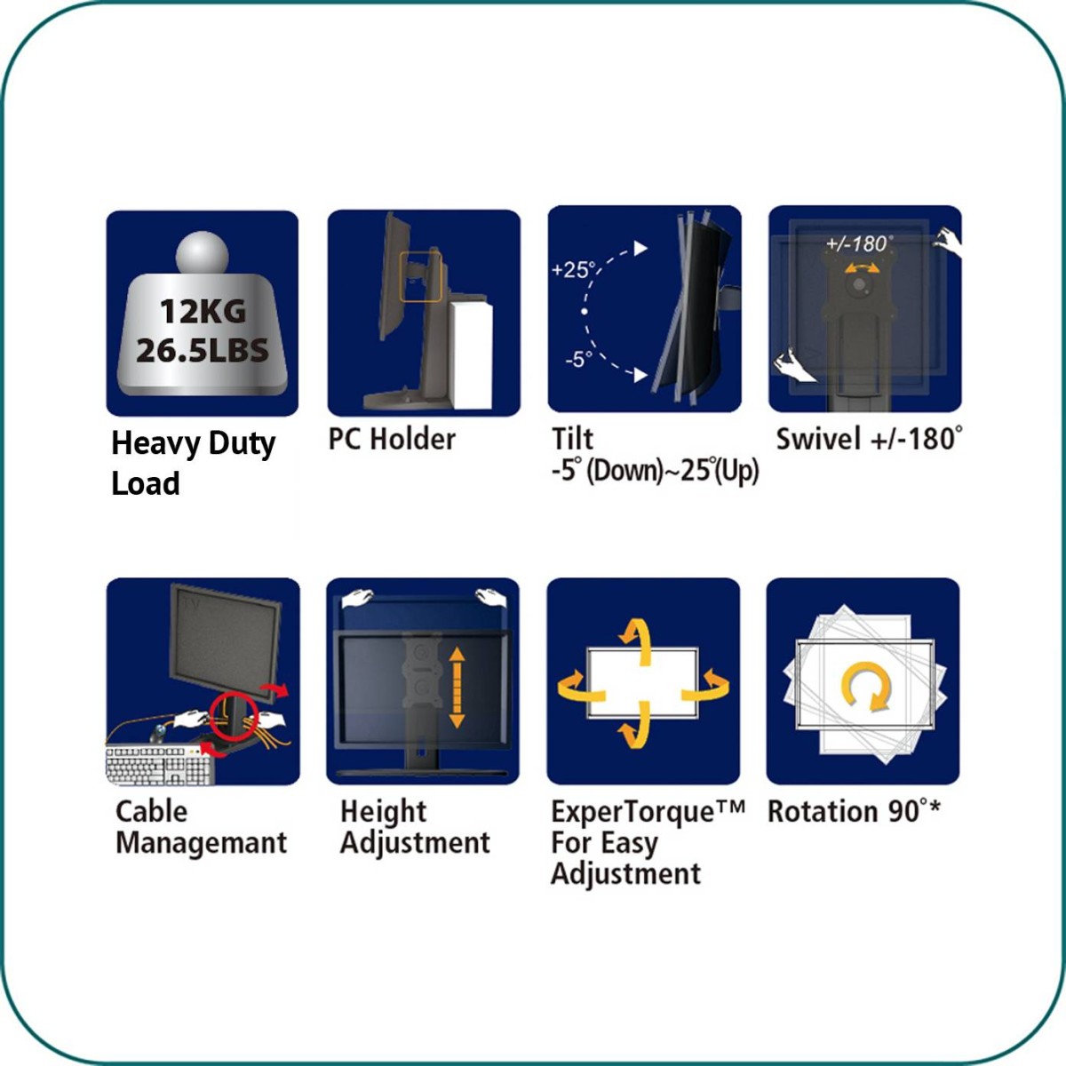 It supports wide angle of Tilt -5° (down) ~+25° (up), Swivel & Rotation 360° with VESA 100x100/75x75mm display and ExperTorque™ technology enables easy adjustment of the screens hinged by its weight.