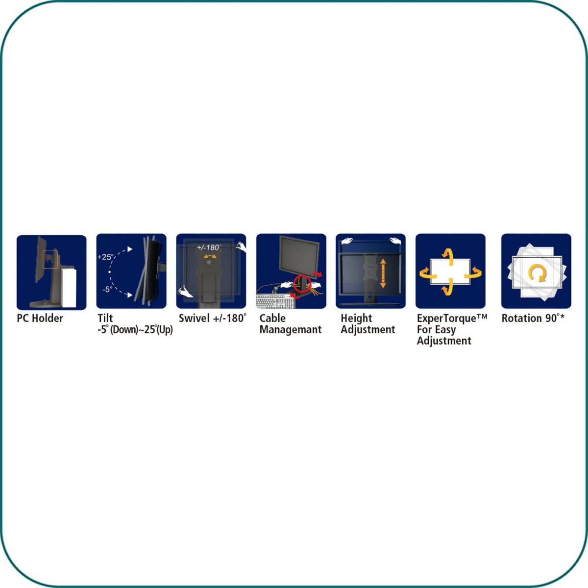 • ExperTorque™ design for easy adjustment hinged by monitor weight