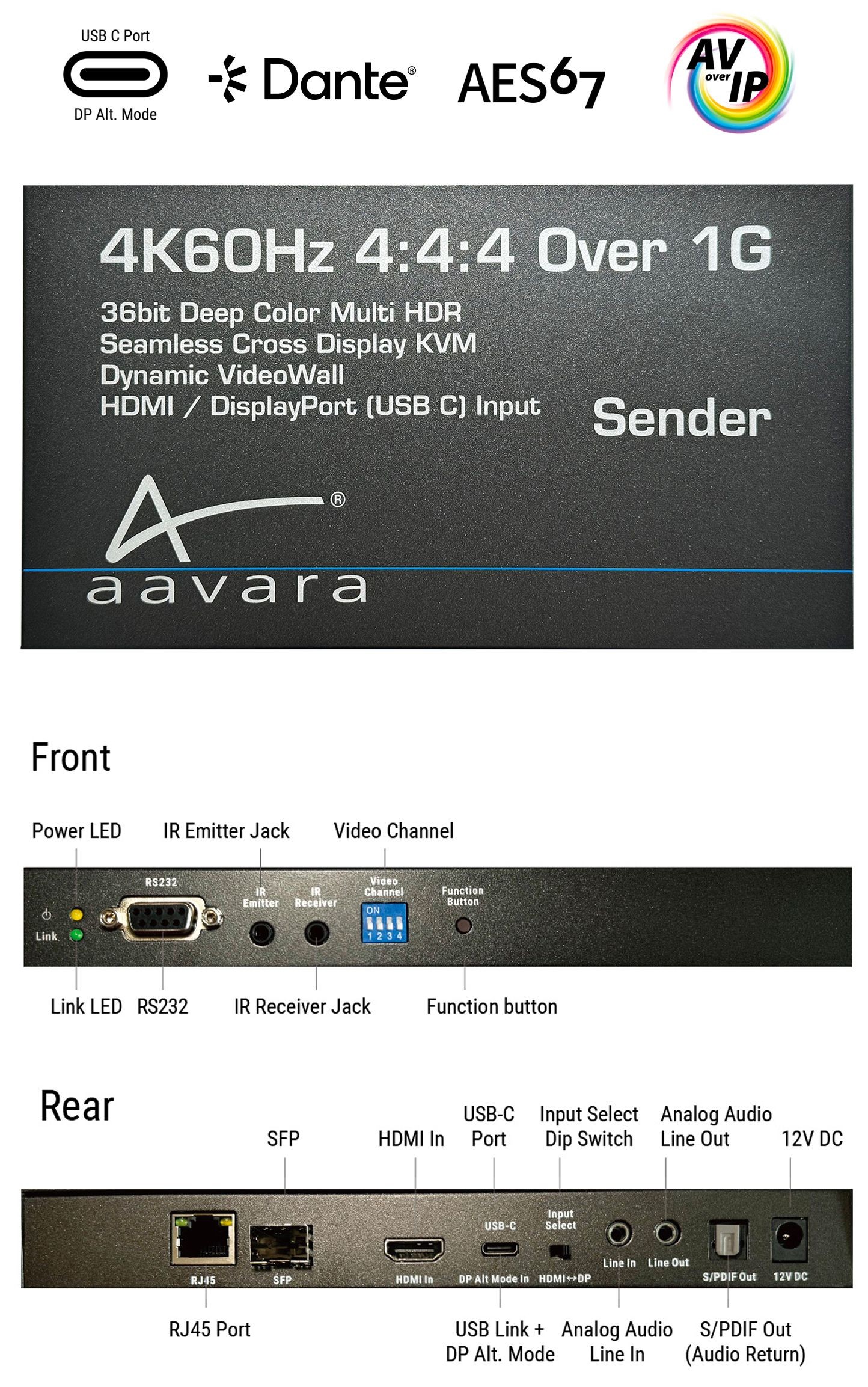Aavara PB9700DNT-SE 4K60Hz 4:4:4 Over IP Sender with HDMI/DisplayPort(USB-C DP Alt. Mode) Input and Dante/AES67 AoIP Support