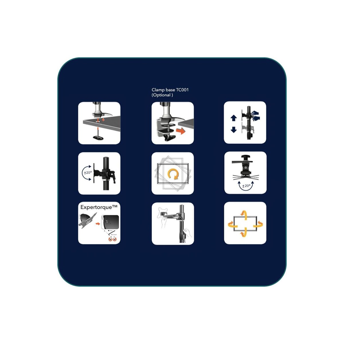 Product code:Aavara TC110 is a Single LED/LCD Monitor clamp base stand, featuring a wide angle of +/- 20 degree Tilt, +/- 90 degree swivel and a 360 degree rotation. It supports VESA 100x100/75x75mm display and ExperTorque™ technology enables adjustment of the screens hinged by its weight. Pole Height adjustment up to 355 mm /13.19''