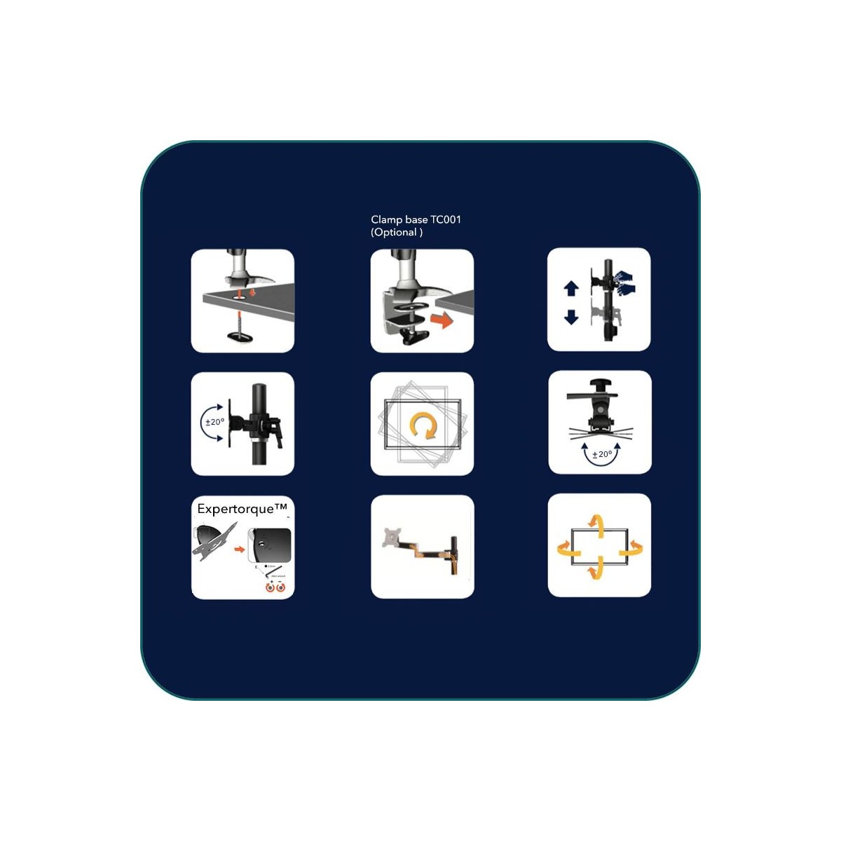• ExperTorque™ design for easy adjustment hinged by monitor weight