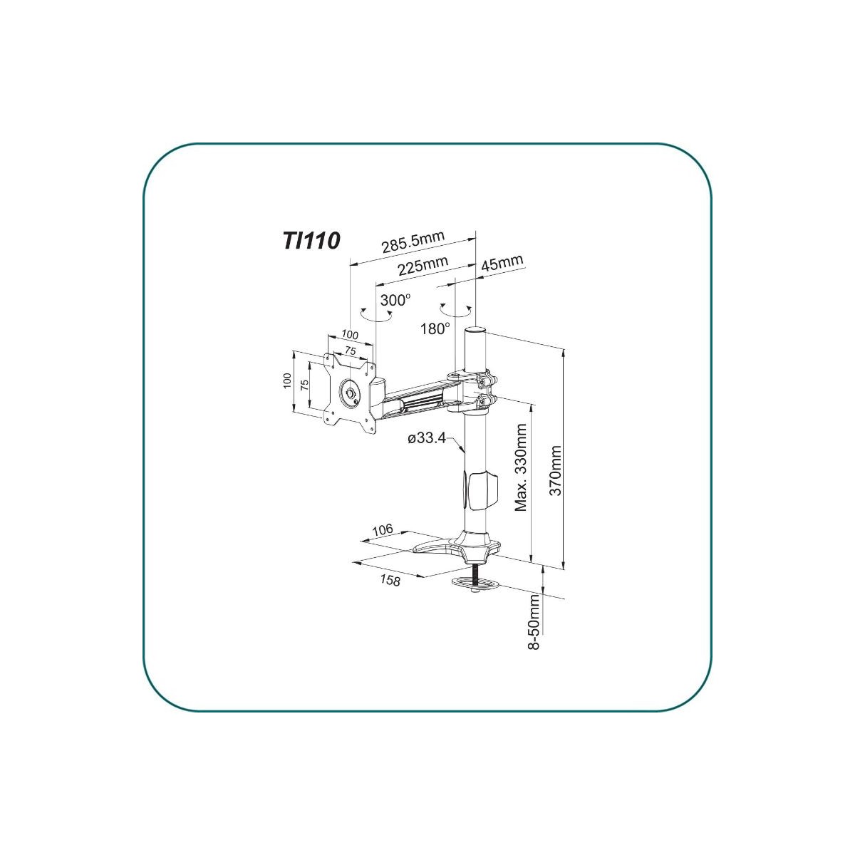 Product code:Aavara TI110 is a Single LED/LCD Monitor grommet base stand, featuring a wide angle of +/- 20 degree Tilt, +/- 90 degree swivel and a 360 degree rotation. It supports VESA 100x100/75x75mm display and ExperTorque™ technology enables adjustment of the screens hinged by its weight. Pole Height adjustment up to 355 mm /13.19''