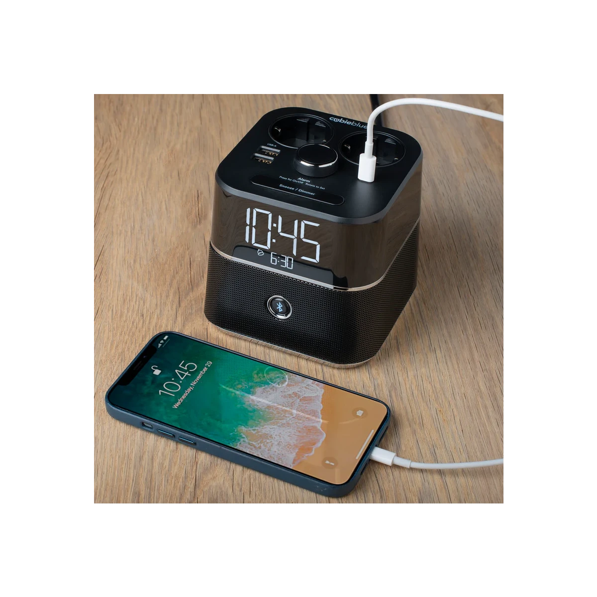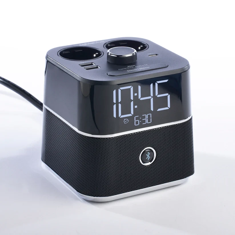 The CubieBlue® charging alarm clock is a trusted choice for hotels across Europe, combining EU power sockets, USB charging (now with USB-C), and a Bluetooth® speaker in one sleek device.