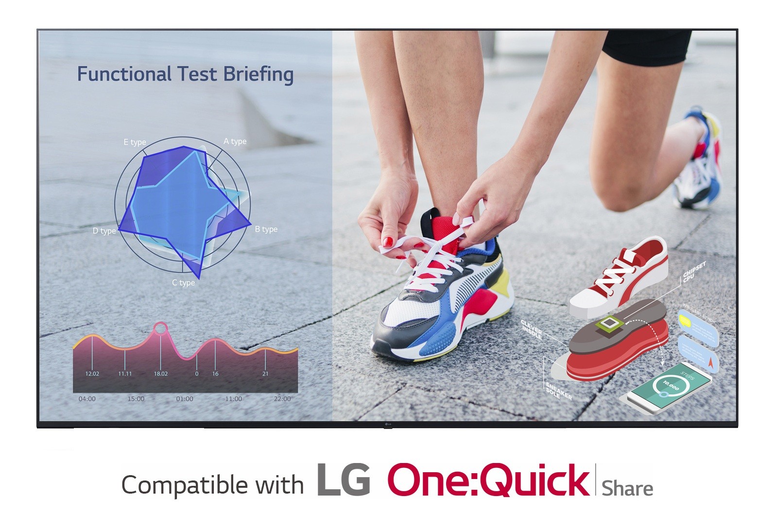 Product code:LG One:Quick Share is a wireless screen sharing solution available through the UL3J series, USB transmission unit, and its app. You can simply share personal PC screen to the display with it's USB dongle button and embedded Wi-Fi*, and can adjust the basic setting values (volume, picture mode, auto bright, etc.) of the connected display without a remote control. Also, the Office Meeting Mode** helps you to display the agenda, note before the meeting starts.