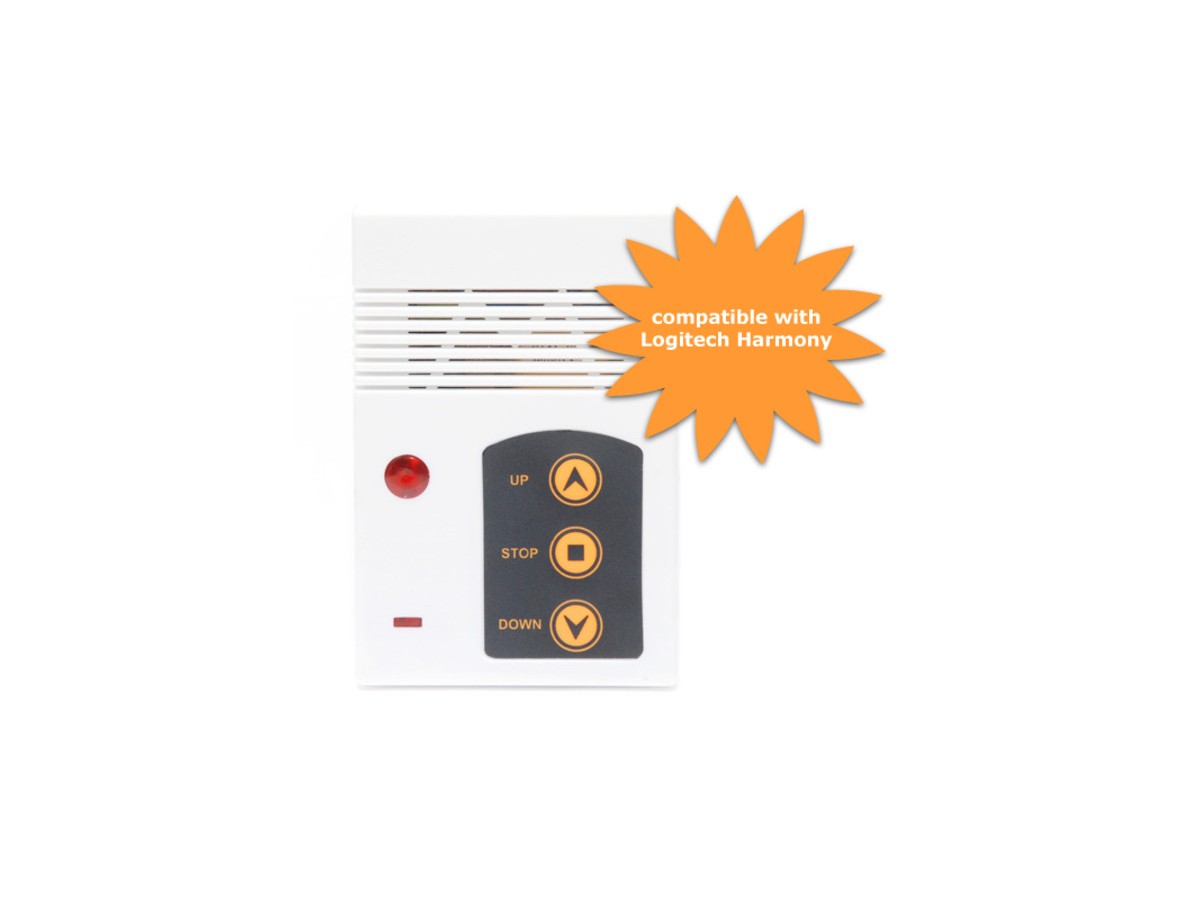 This extra remote transmitter kit uses infrared connectivity (IR) and therefore works well with learnable IR master control systems like the Logitech Harmony series.