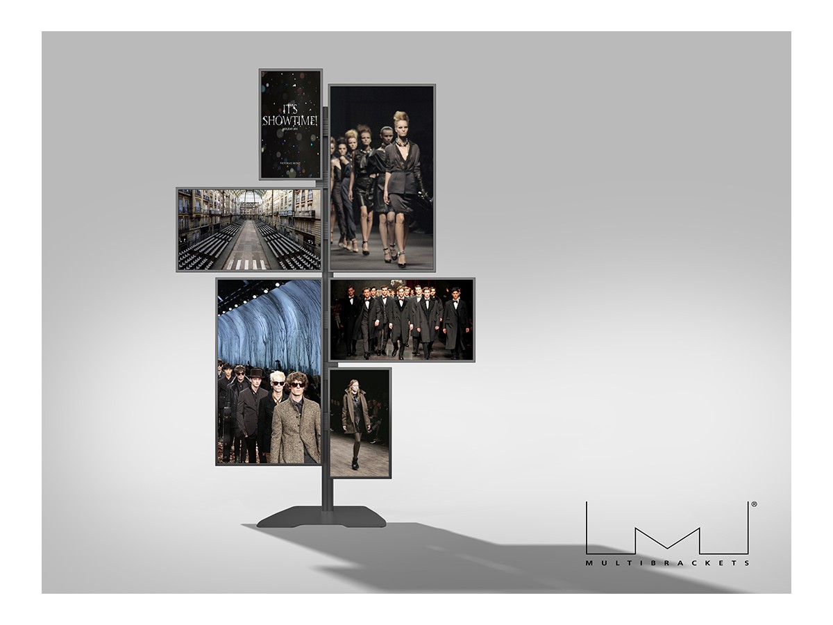 The M Pro Series Video Wall Stand MBF6U Art creates a rock steady screen display solution aimed for the retail store, mall or any other public area. 50mm black, brass or chrome tubes can be tailored to fit the environment the unit is positioned in. Mount screens with tilt or fixed displays. Place them side by side and/or above each other.