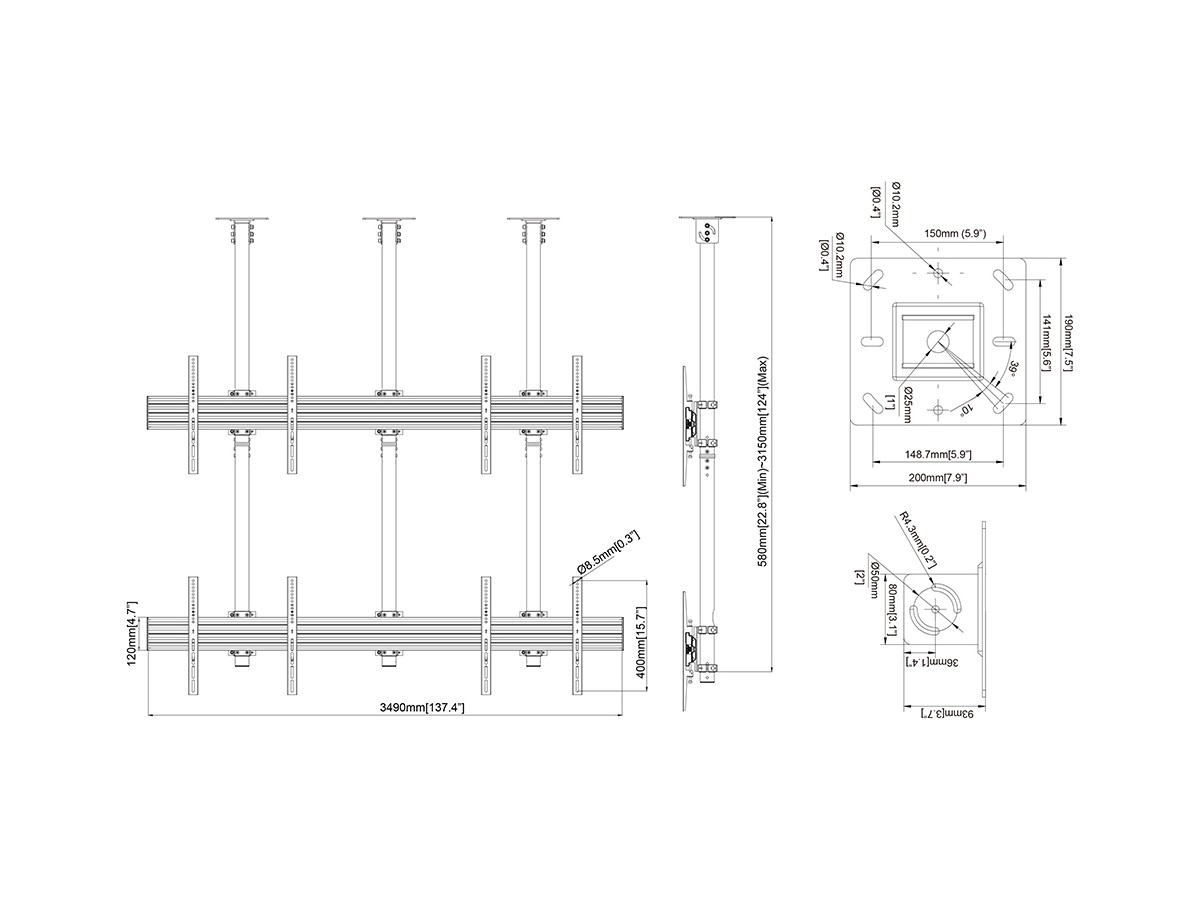 Product code:M Ceiling Mount Pro MBC2X2U HD - Ceiling mount for Displays, steel, 3m length, 4 screens, single side, fixed arms, VESA Max 600x400 - screen size: 75"-100" - black