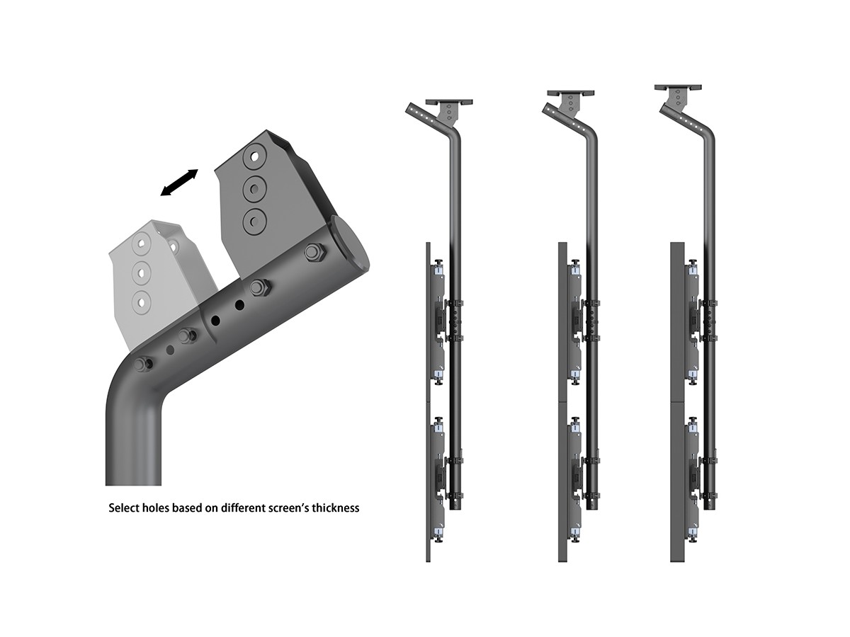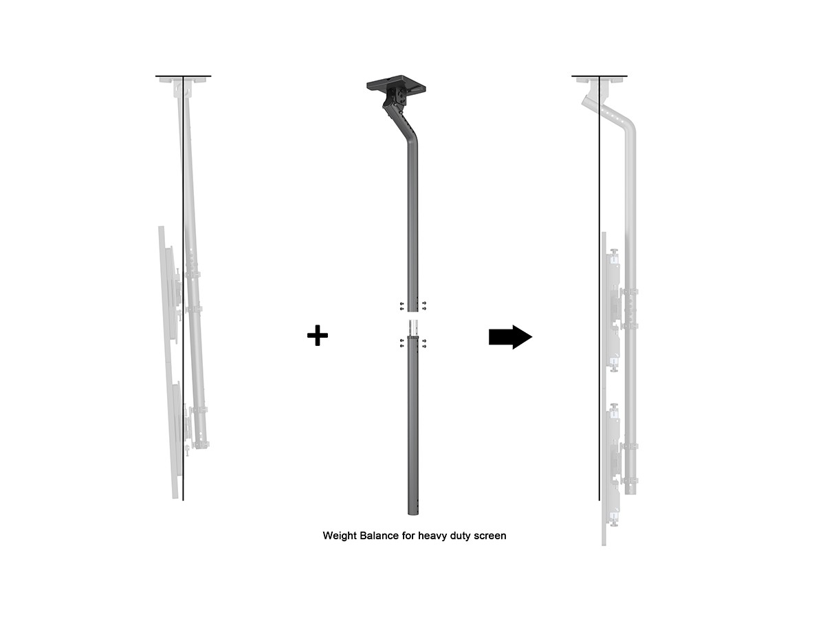 The MBC2X2UGC HD is a strong, innovative ceiling mount that hangs large displays up to 100" with the natural center of gravity to provide a stable, durable installation. The angled column aligns the center of gravity of the display with the mounting point to reduce stress on the coupler joint and to prevent the column from appearing like it is angled rather than hanging straight down. With the Pro Series modular construction installers have vast possibilities to change, update and reconfigure its design if ideas change over time then Pro Series can follow.