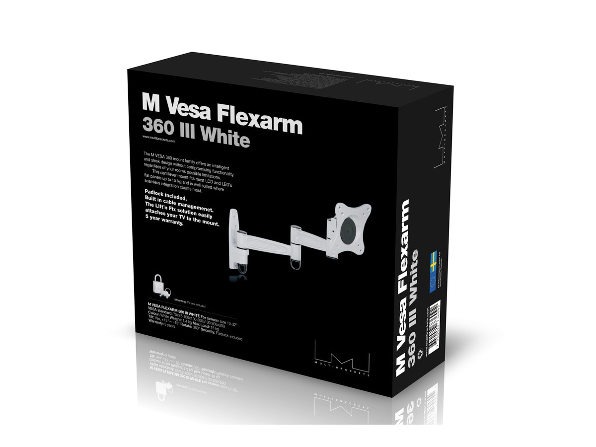 The M VESA Flexarm 360 offers a flexible alternative to rigid wall mounts for displays weighing up to 15kgs. Multibrackets VESA Flexarm 360 can both tilt and rotate. Still it is safely secured with the included padlock.