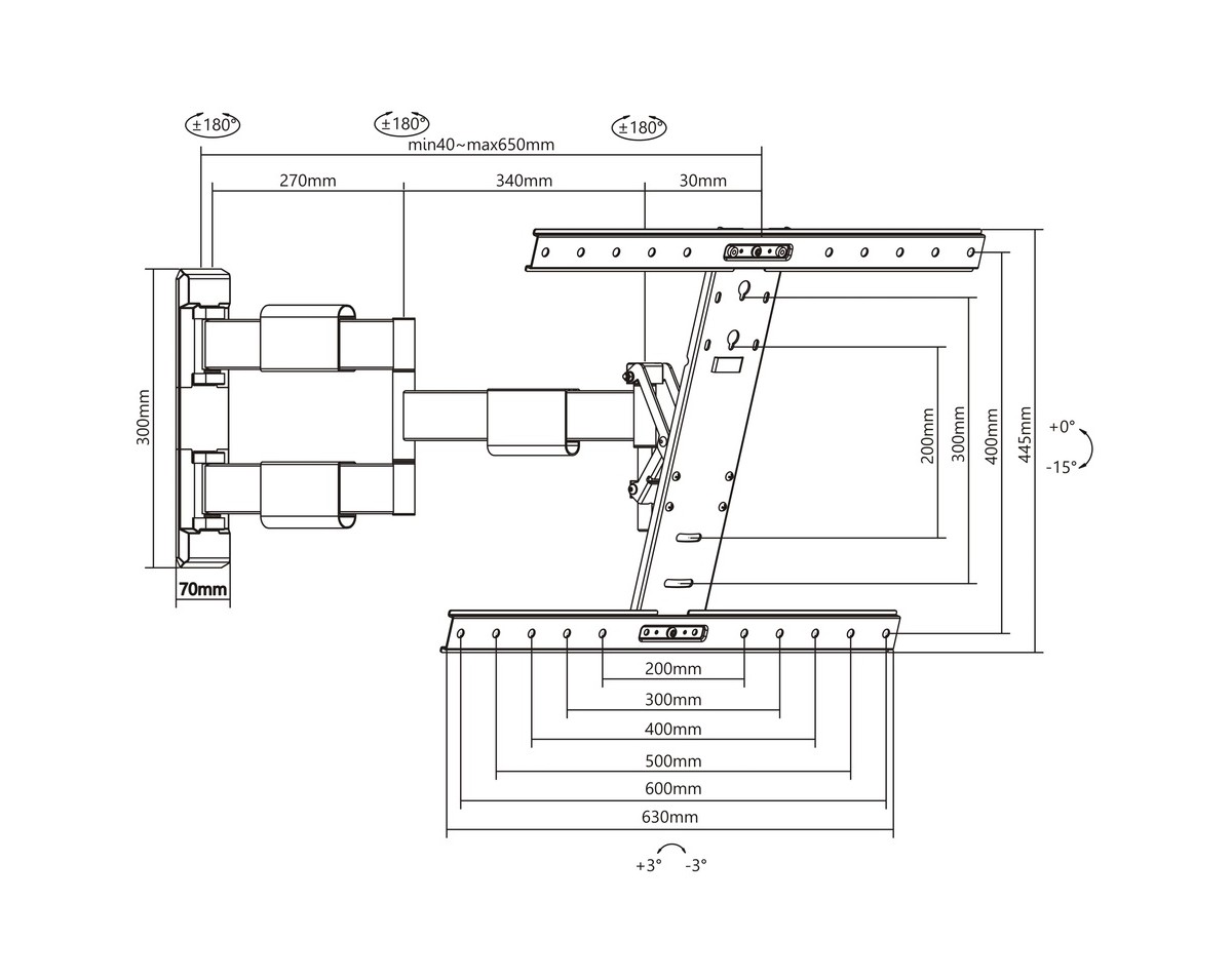 This one of a kind swing-out arm extends a massive 65 centimeters from the wall and provides 15° of downward tilt, 180° swivel and -3° — +3° level adjustment. This makes it possible to achieve "full motion" and the desired viewing angle from virtually anywhere in a room. The lightweight mount retracts smoothly and easily to a mere 39 mm from the wall. To keep power and cables protected when pulling or pushing the display, cable management channels are built into the arms.