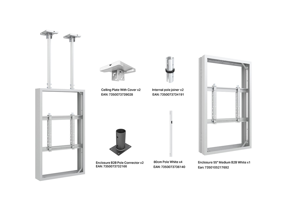 The M Pro Series Enclosure Ceiling Mount B2B 55" Medium White. A well-designed casing /enclosure. Creating a minimalistic look and possible to mount in both Portrait or Landscape position this casing from Multibrackets® is one of the most versatile to date. Choose between screen sizes and colors. The casing includes after adjustment possibilities and can be used for most brands of signage displays on the market. With a smart thermal management, this solution can fit more brands as well as creating thermal management second to none.