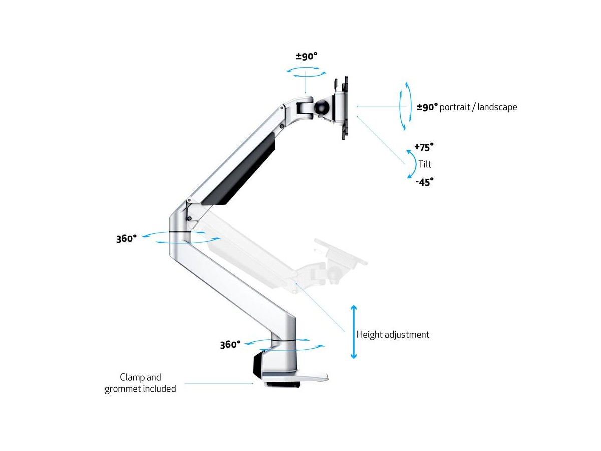 The M VESA Gas Lift Arm is made out of a durable aluminum construction and uses a gas driven suspension technique. This makes the screen "float" and it can then be moved with near zero effort. Sleek and streamlined, the M VESA Gas Lift Arm Single frees up space and allows positioning of your display for greater productivity. The unique counterbalance gas technology provides smooth adjustment in any direction. Easy move the screen from landscape to portrait position or move the screen close to the desk, high up, matching almost any wanted working position imaginable.
