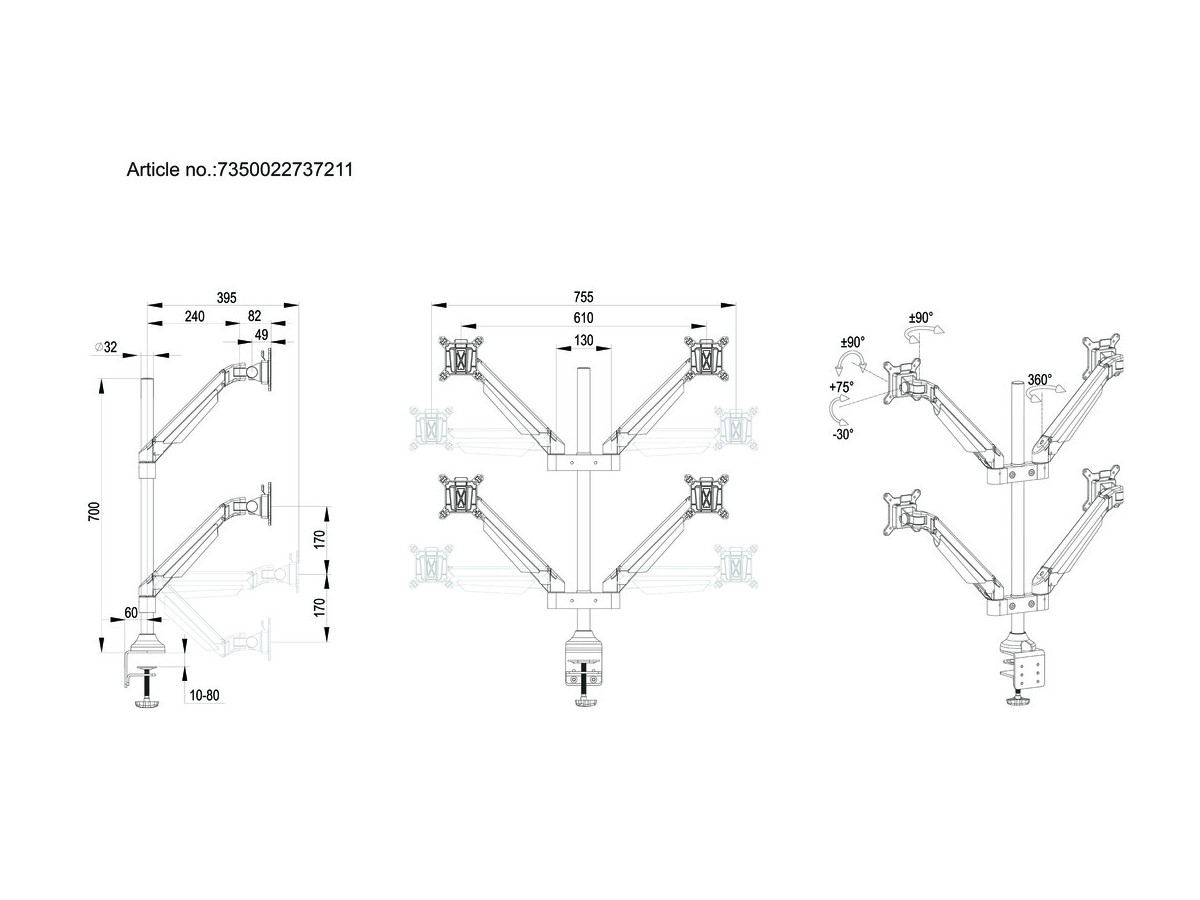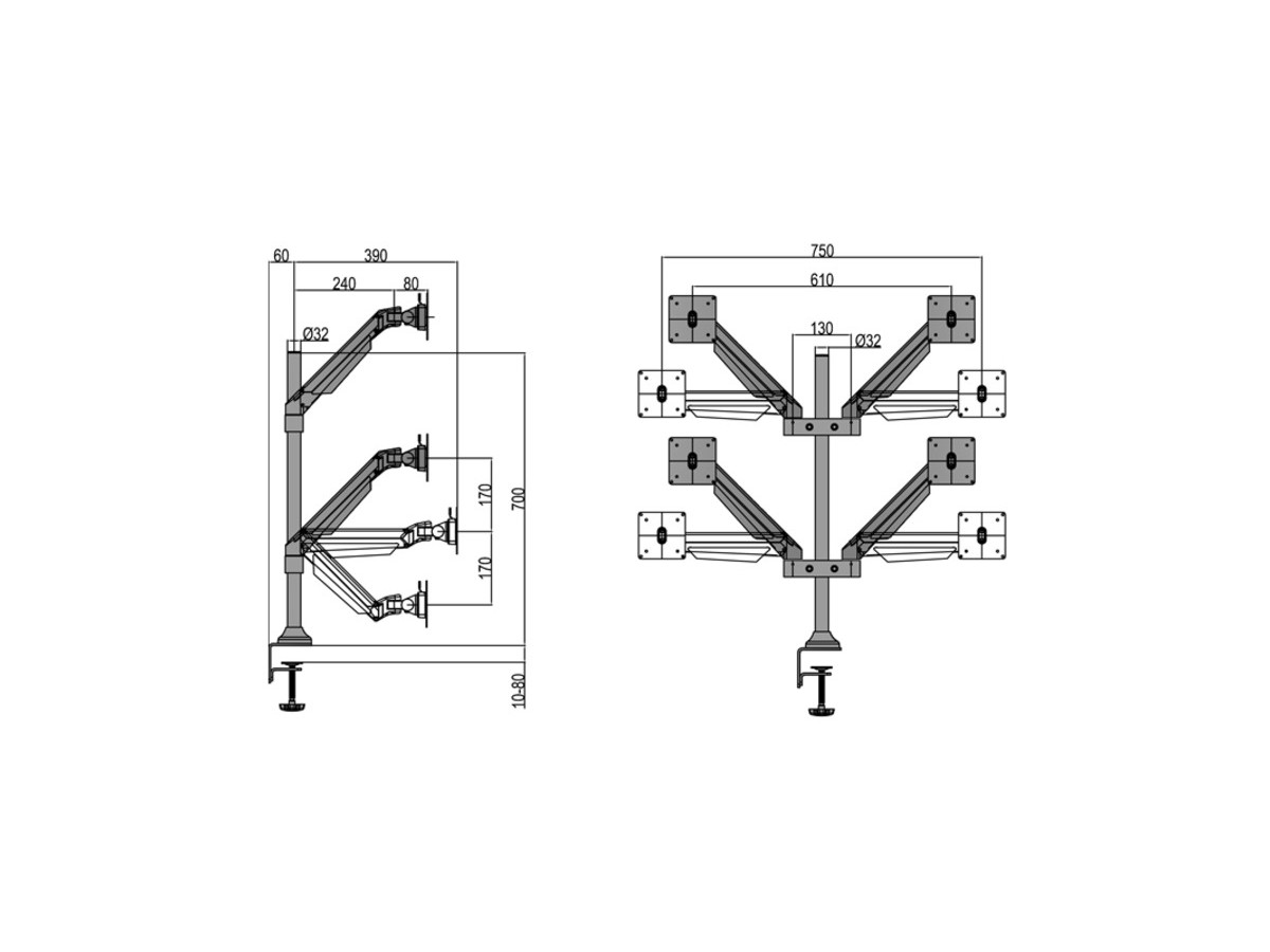 Product code:Multibrackets M VESA Gas Lift Arm Quad - Mounting kit ( desk clamp mount, 4 articulating arms ) for 4 LCD displays - aluminum - white - screen size: 15" - 32"