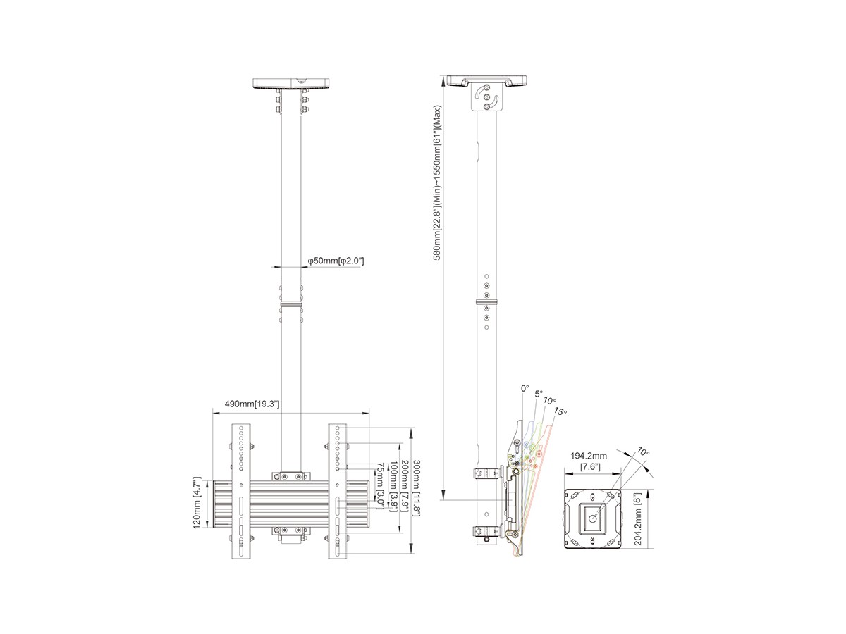 | Pillar length: | Min: 580mm to Max: 1550 mm from ceiling to VESA plate center Extension pipes: 1.5m (800mm*2pcs) included |