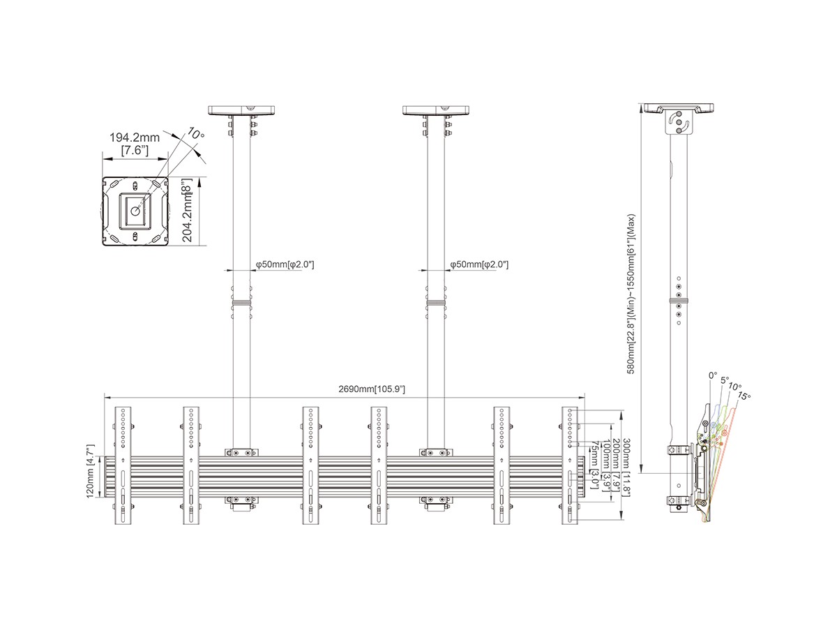 | Pillar length: | 580 mm to 750 mm from ceiling to VESA plate center Pole length: 1.5m (800mm*4pcs included) |