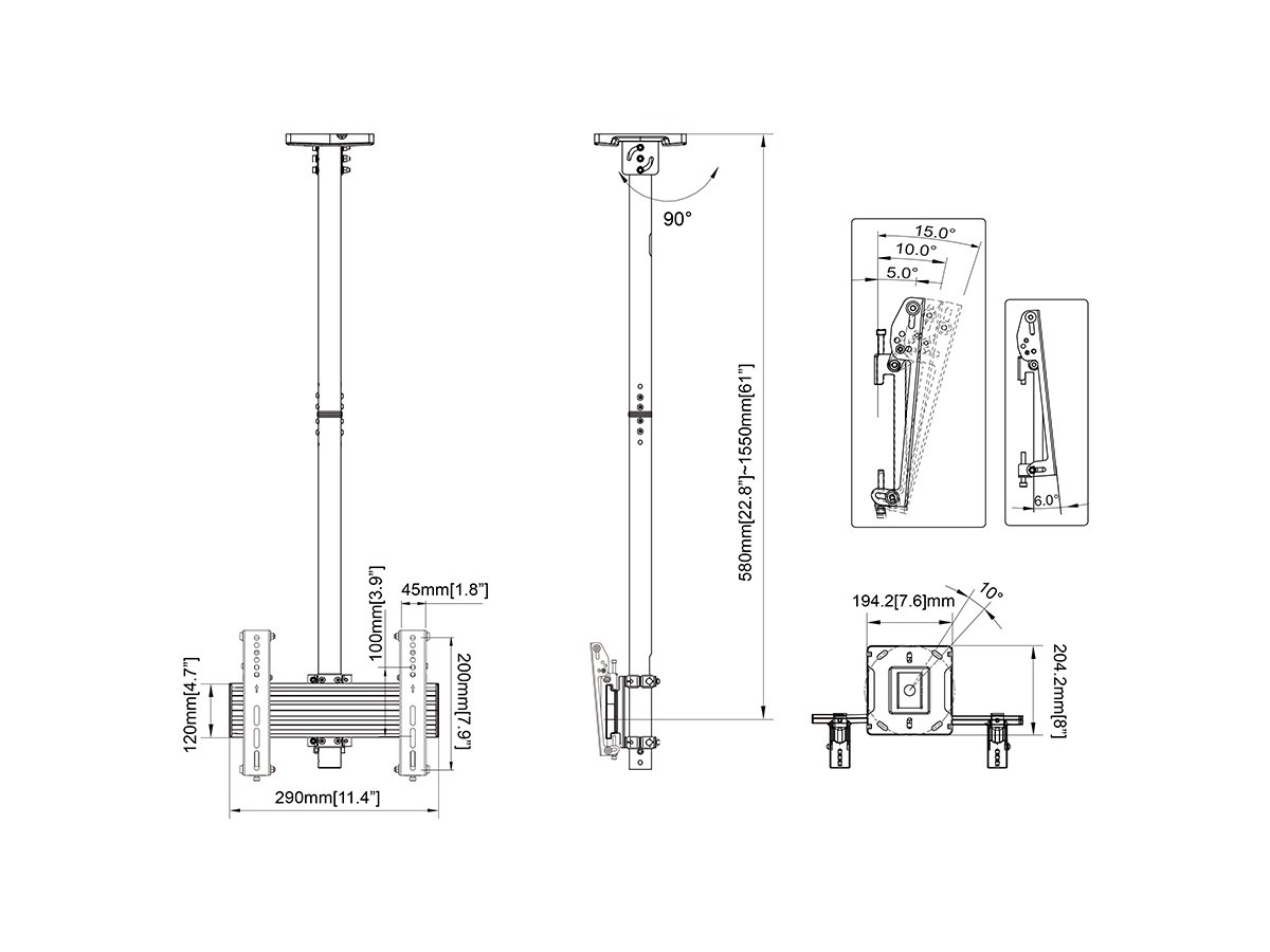 | Pillar length: | Min: 580mm to Max: 1550 mm from ceiling to VESA plate center Extension pipes: 1.5m (800mm*2pcs) included |