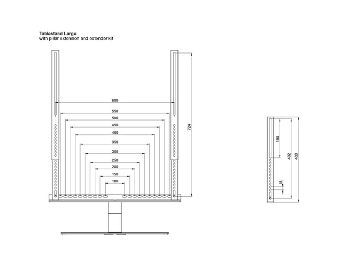 The M VESA Extender kit Turn & Motorized Tablestand works with both the basic Tablestand Turn and the Motorized version from Multibrackets. The Extender kit is assisting users who have a large screen size for their table stand, or if the VESA holes are placed high up on the screen backside. Both situations where the screen would need to be moved to a higher position.