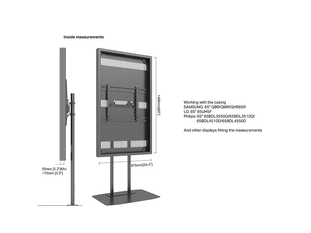 | Installation: | Samsung 65" QBR/QMR/QMB/QHR65R LG 65" 65UH5F Philips 65" 65BDL3550Q/65BDL3510Q/65BDL4510D/65BDL4550D Sony FW-65BZ40L BenQ 6502S + other 65" displays not model specified here (check measurements) |