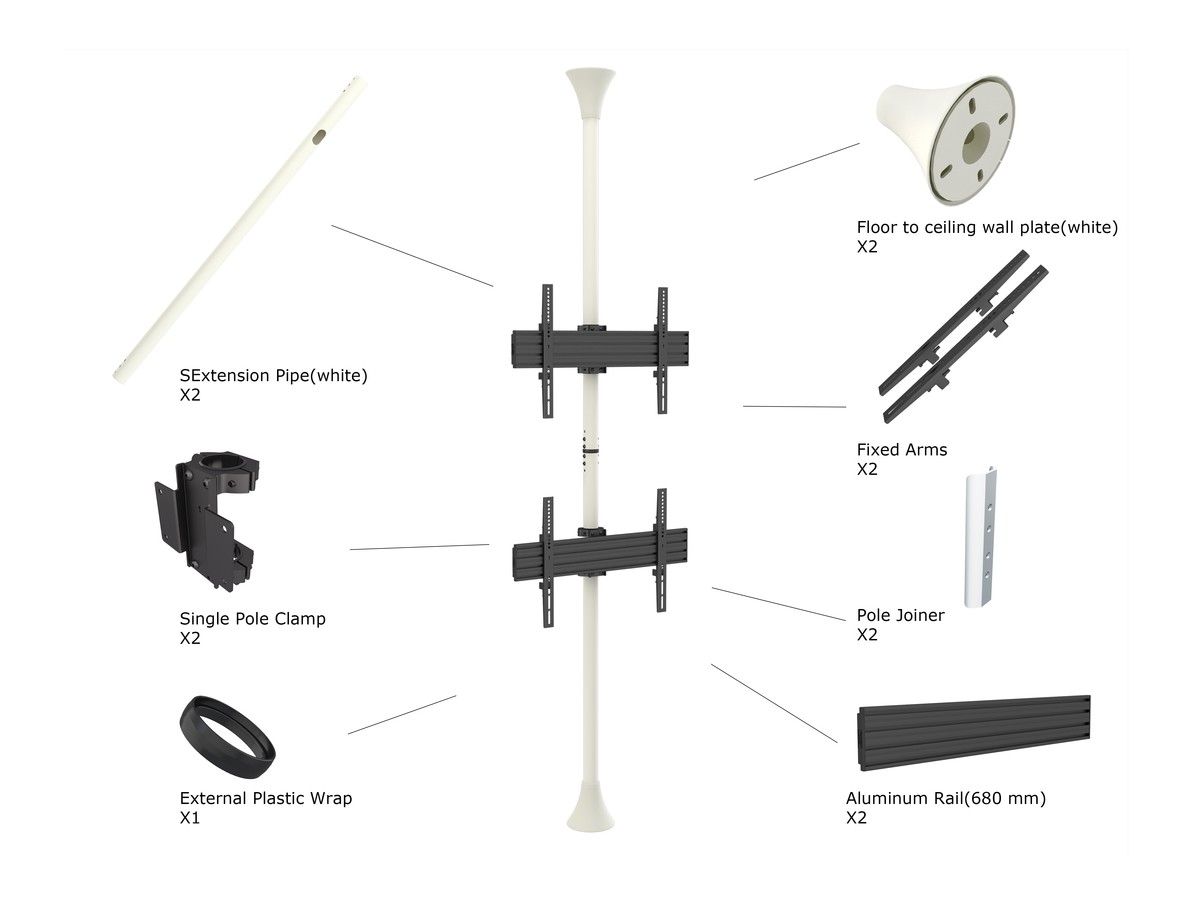 | Pillar length: | Min: 580mm to Max: 1550 mm from ceiling to VESA plate center Extension pipes: 3m (1500mm*2pcs) included |