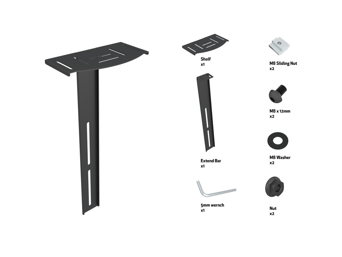 M Pro Series - Camera Shelf is an optional part for the M Pro Series. This video conferencing camera shelf is designed to attach to the Pro Series railsystem (design protected). The shelf provides a height adjustable platform to convert a any Pro Series wallmount, ceilingmount or stand into a video conference platform.