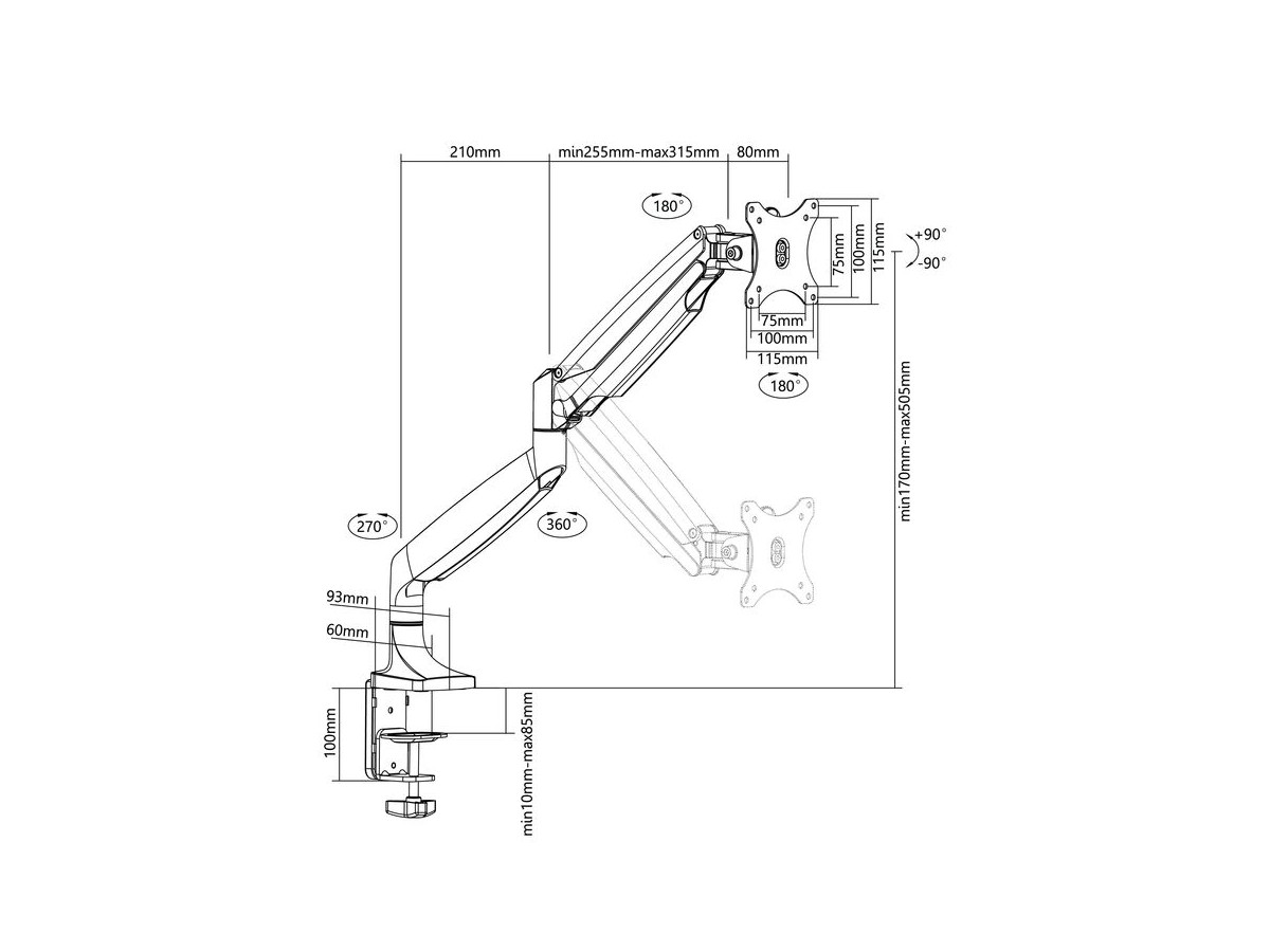| Height: | 170 - 505mm Adjustable from table top to VESA plate center |