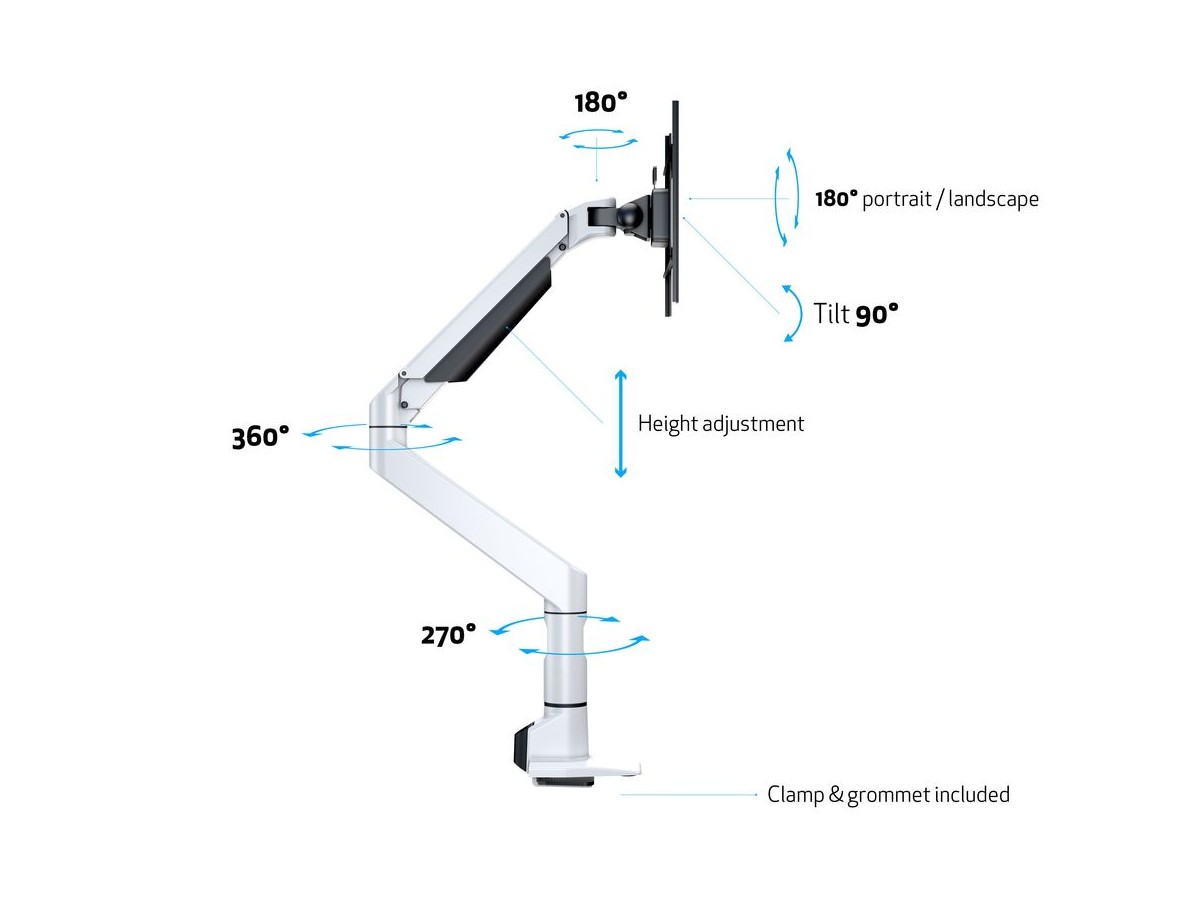 The M VESA Gas Lift XL Single White is made out of a durable aluminum construction and uses a gas driven suspension technique. This makes the screen "float" and it can then be moved with near zero effort. Sleek and streamlined, the M VESA Gas Lift XL Single White frees up space and allows positioning of your display for greater productivity. With a maxload of up to 10kg even very big monitors can be used. The height clearance is 615 mm above the desk. Rotation function is not used for widescreen or ultrawide screen monitors. The unique counterbalance gas technology provides smooth adjustment in any direction. Easy move the screen from landscape to portrait position or move the screen close to the desk, high up, matching almost any wanted working position imaginable.