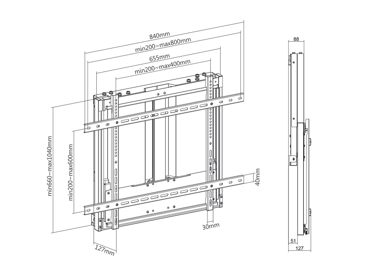 | Mounting holes (VESA): | 200x200,300x200,300x300,400x200,400x300,400x400,600x400,700x400,800x500,800x400,800x600 mm |