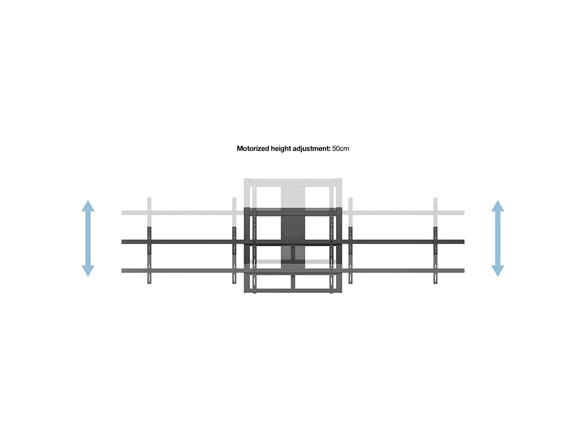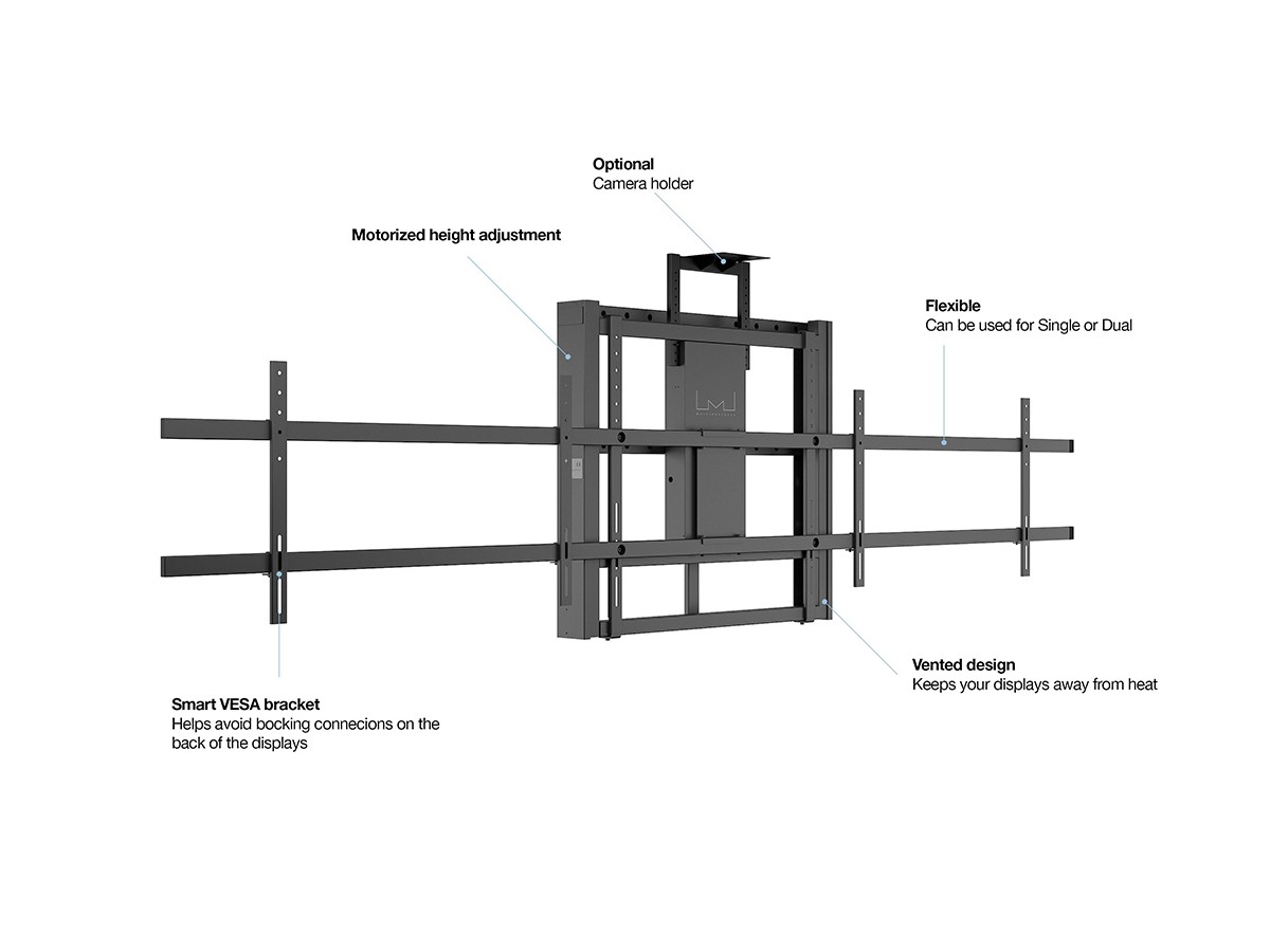 The motor-driven height adjustment allow you to move two displays up or down to a suitable height for any presentation, touchscreens or other meetingroom applications. The wide reach up or down makes it suitable for both a sitting or standing audience, making this product a perfect multifunctional solution for any need.