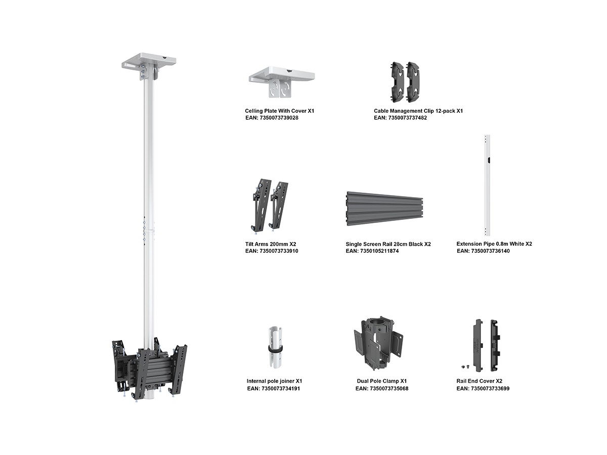 Product code:M Ceiling Mount Pro MBC1UX2 White VESA 200 - Ceiling mount for LCD display, steel, 1.5m length, 2 screens, dual side, tilt arms, VESA Max 200x200 - screen size: 24"-42" - white
