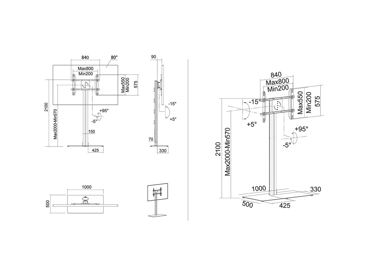 With the 210 cm height the floor stand is useful for both for home and work like conference rooms and other situations where the viewers are sitting down or standing up.