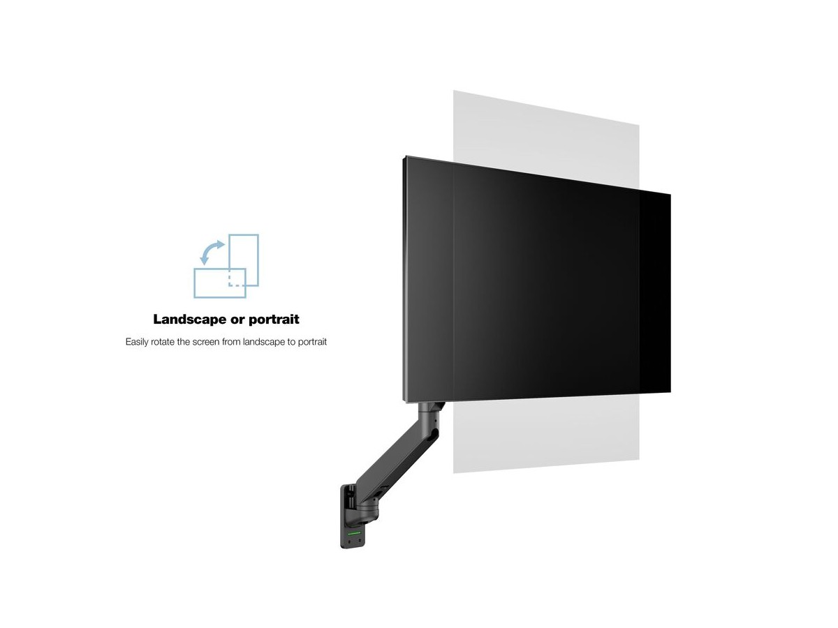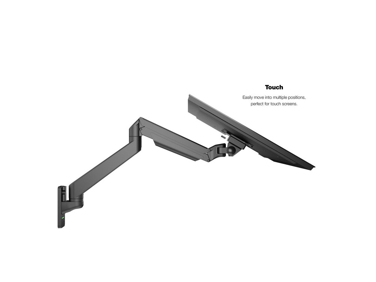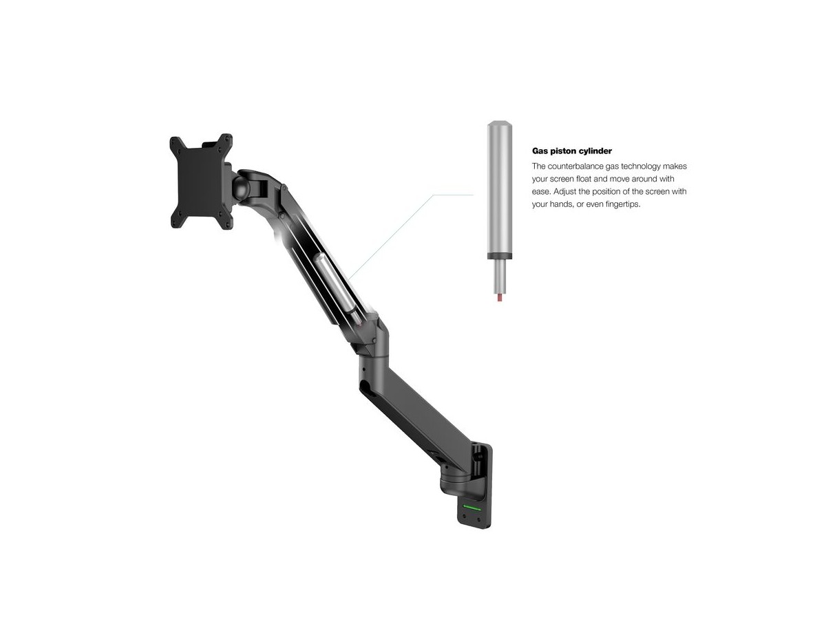 Our M VESA Gas Lift Arm Single Wall is made out of a durable aluminum construction and uses a gas driven suspension technique. This makes the screen "float" and it can then be moved with near zero effort. Sleek and streamlined, the M VESA Gas Lift Arm Single Wall frees up space and allows positioning of your display for greater productivity. The unique counterbalance gas technology provides smooth adjustment in any direction. Easy move the screen from landscape to portrait position or move the screen close to the desk, high up, matching almost any wanted working position imaginable.