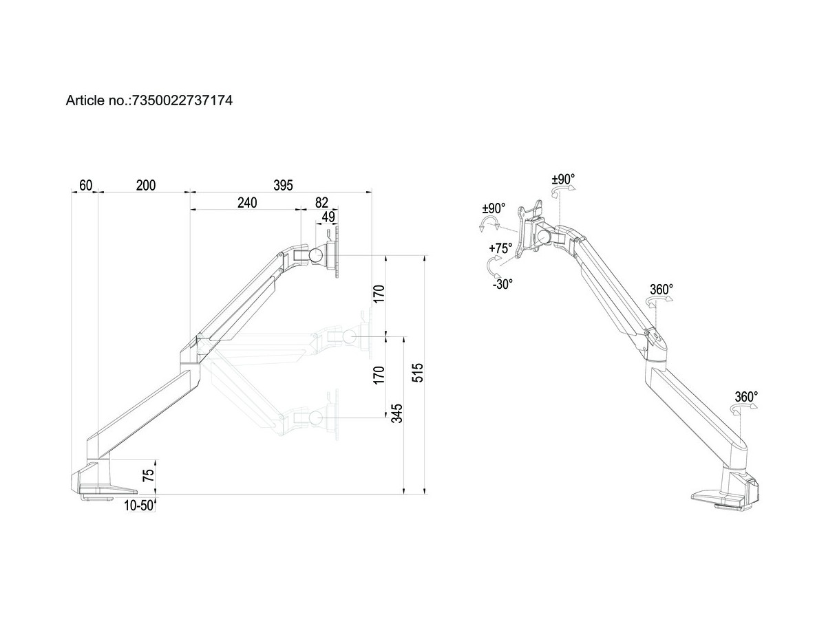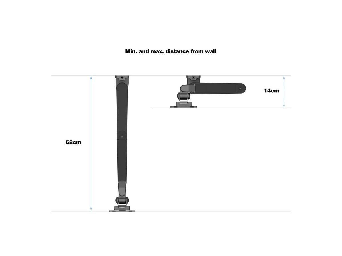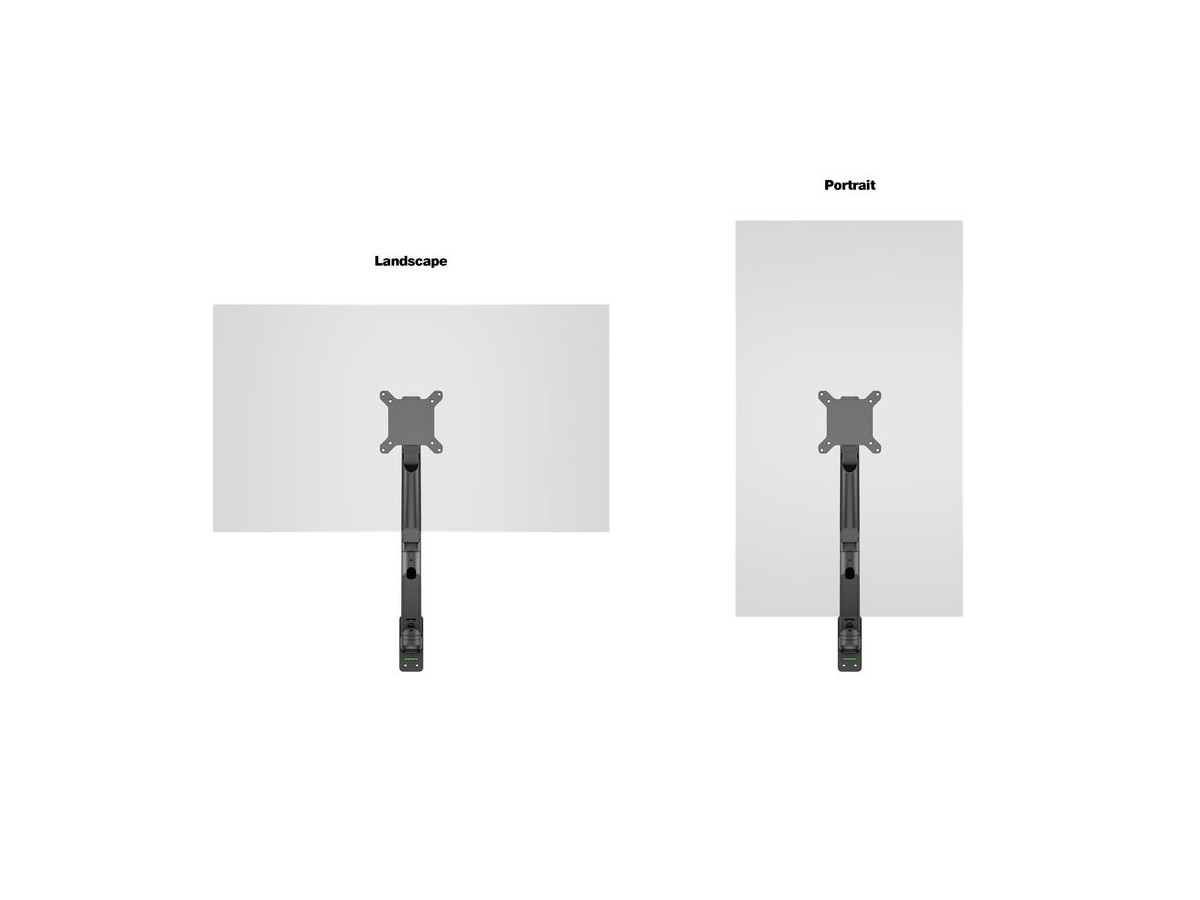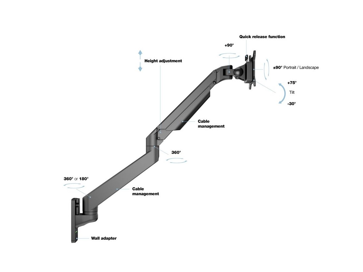 Our M VESA Gas Lift Arm Single Wall is made out of a durable aluminum construction and uses a gas driven suspension technique. This makes the screen "float" and it can then be moved with near zero effort. Sleek and streamlined, the M VESA Gas Lift Arm Single Wall frees up space and allows positioning of your display for greater productivity. The unique counterbalance gas technology provides smooth adjustment in any direction. Easy move the screen from landscape to portrait position or move the screen close to the desk, high up, matching almost any wanted working position imaginable.
