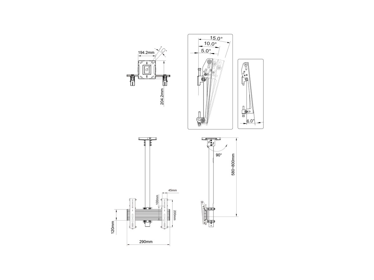 | Pillar length: | Min: 580mm to Max: 1550 mm from ceiling to VESA plate center Extension pipes: 1.5m (800mm*2pcs) included |