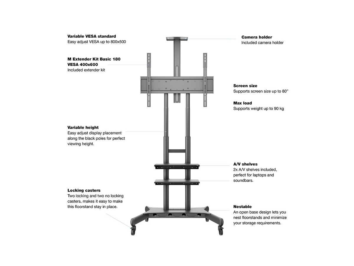 The Multibrackets M Public Floorstand Basic 180 Plus, is a mobile TV -Stand capable of supporting any display, touchscreen or Interactive -display up to a screen size 80”, 90kg in weight and up to 800x600mm VESA.