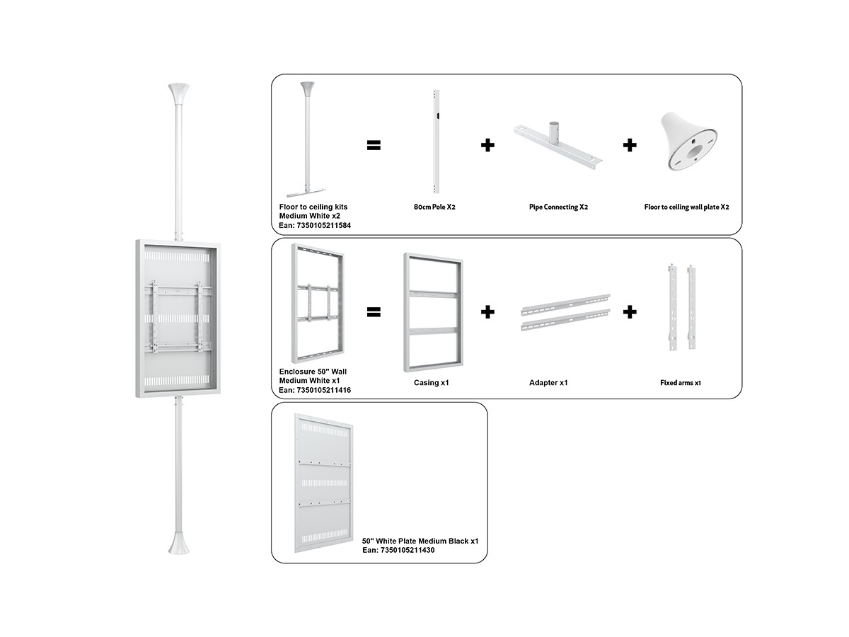 Product code:M Pro Series Enclosure 50" Floor to Ceiling Medium – Floor to ceiling mount with casing for display, steel, 3m length, 1 screen, single side, fixed arms, VESA max 600x400 - screen size: 50" - white