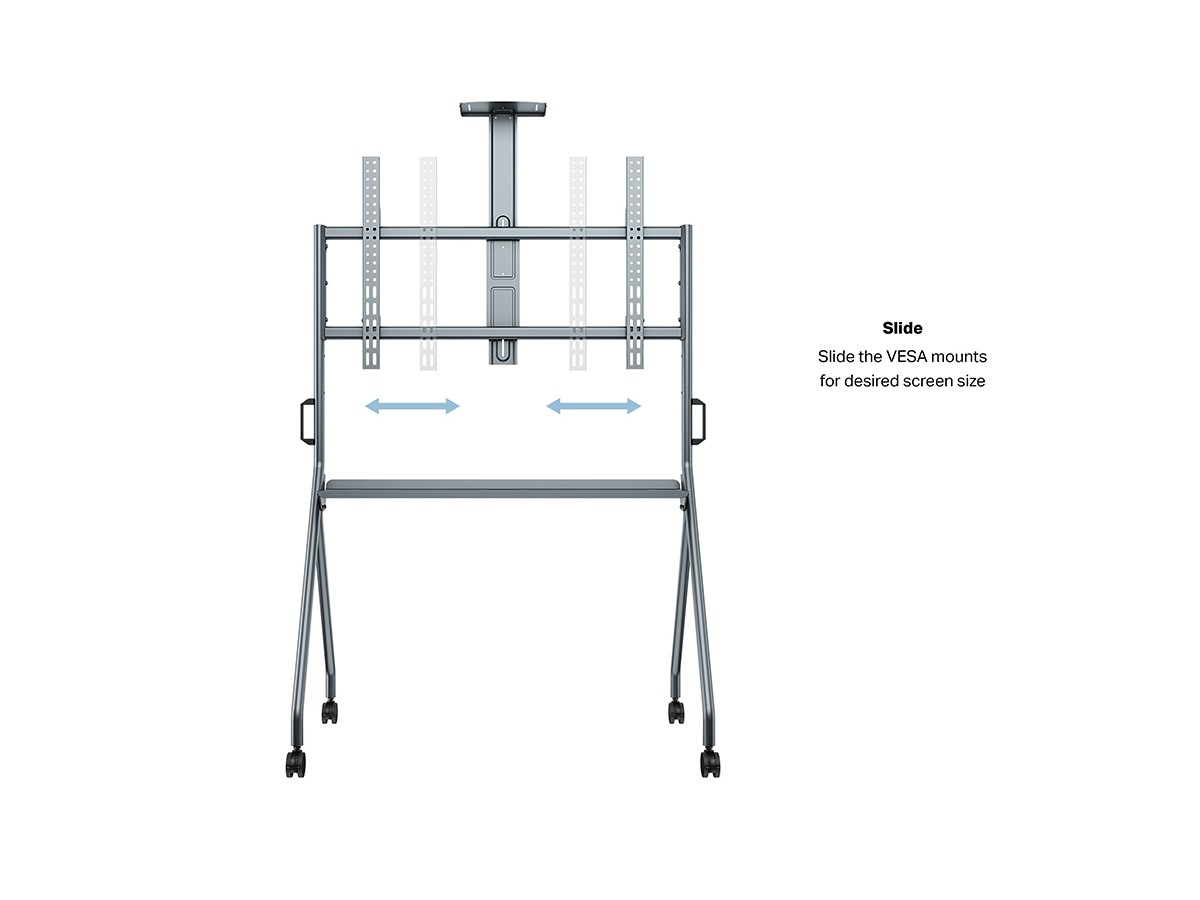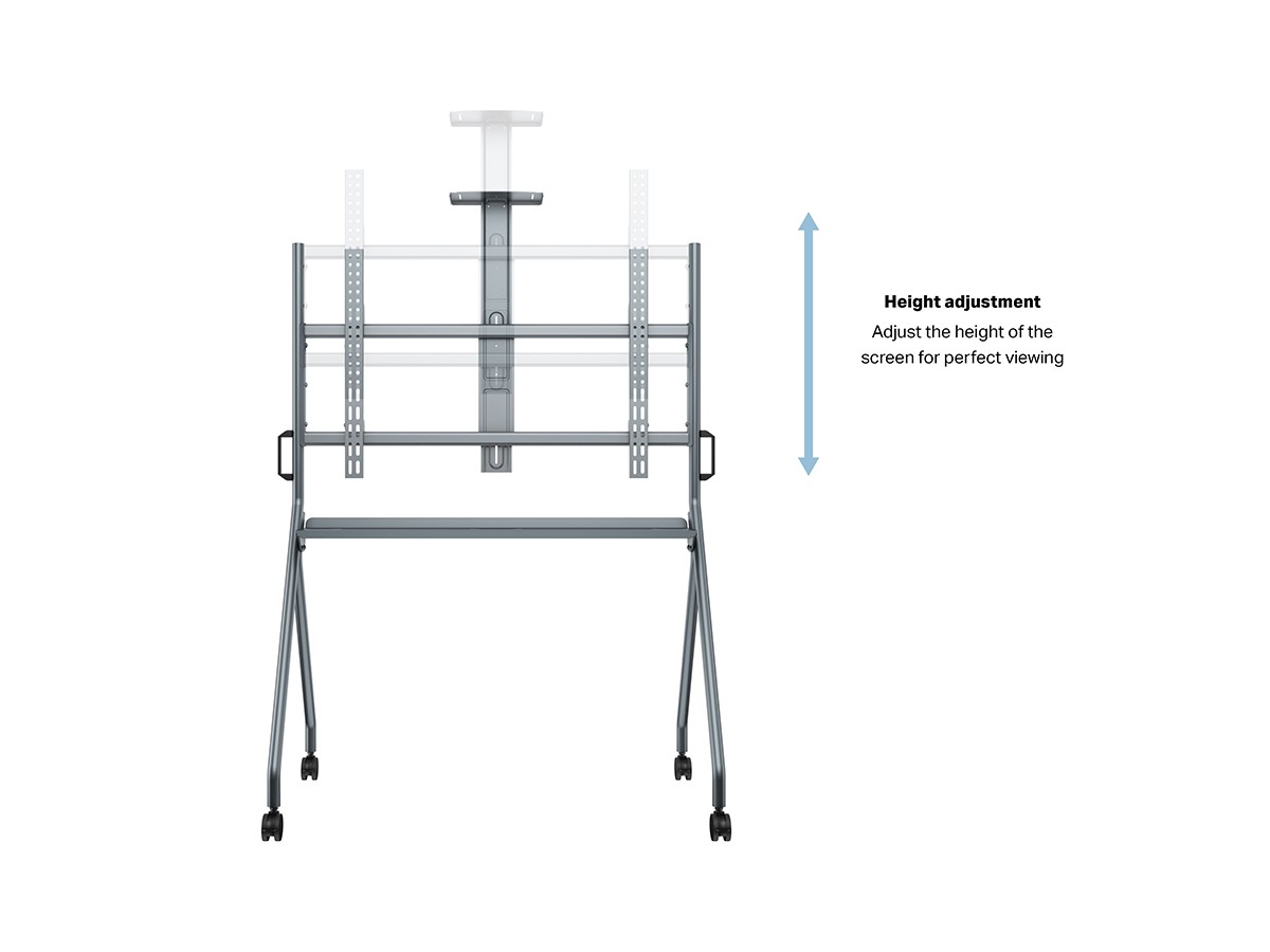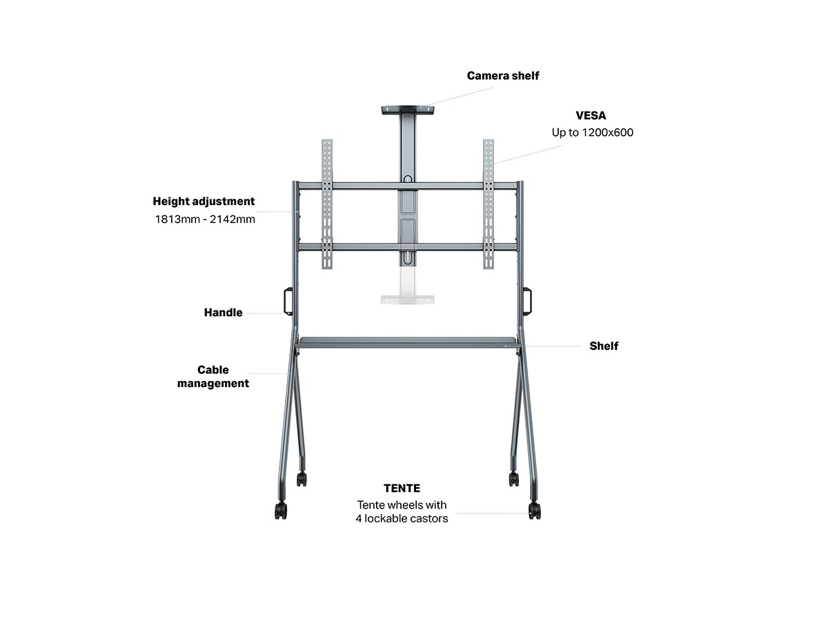 Easy screen height- adjustment, and mobility mean that an optimal viewing position can always be achieved for any presentation, digital -signage or video-conference situation. The heavy -duty TENTE castors feature a safety- brake, ensuring the stand cannot roll out of position, whilst the cable- management system ensures a tidy and professional look.