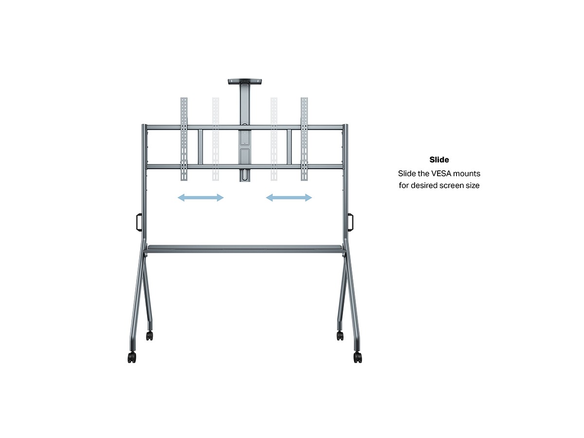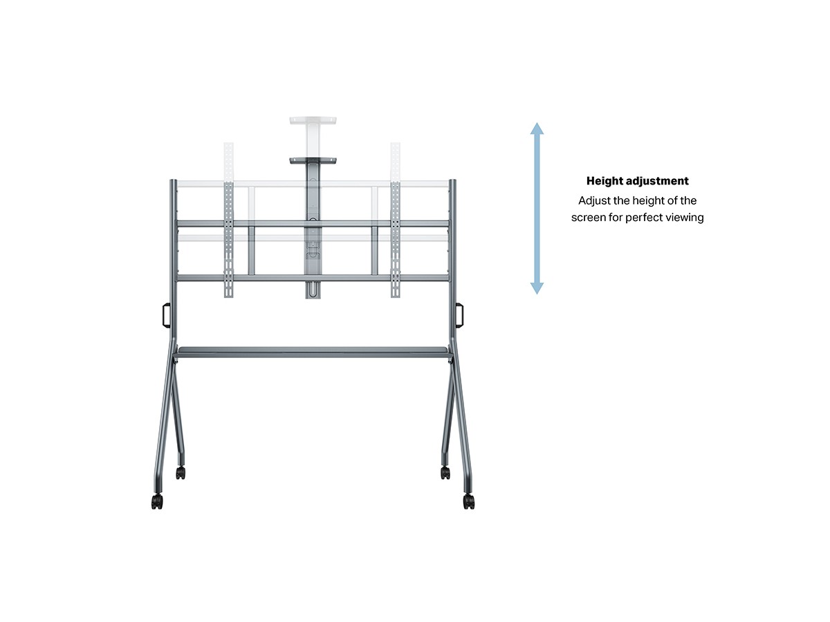 Easy screen height- adjustment, and mobility mean that an optimal viewing position can always be achieved for any presentation, digital -signage or video-conference situation. The heavy -duty TENTE castors feature a safety- brake, ensuring the stand cannot roll out of position, whilst the Integrated cable- management system ensures a tidy and professional look.