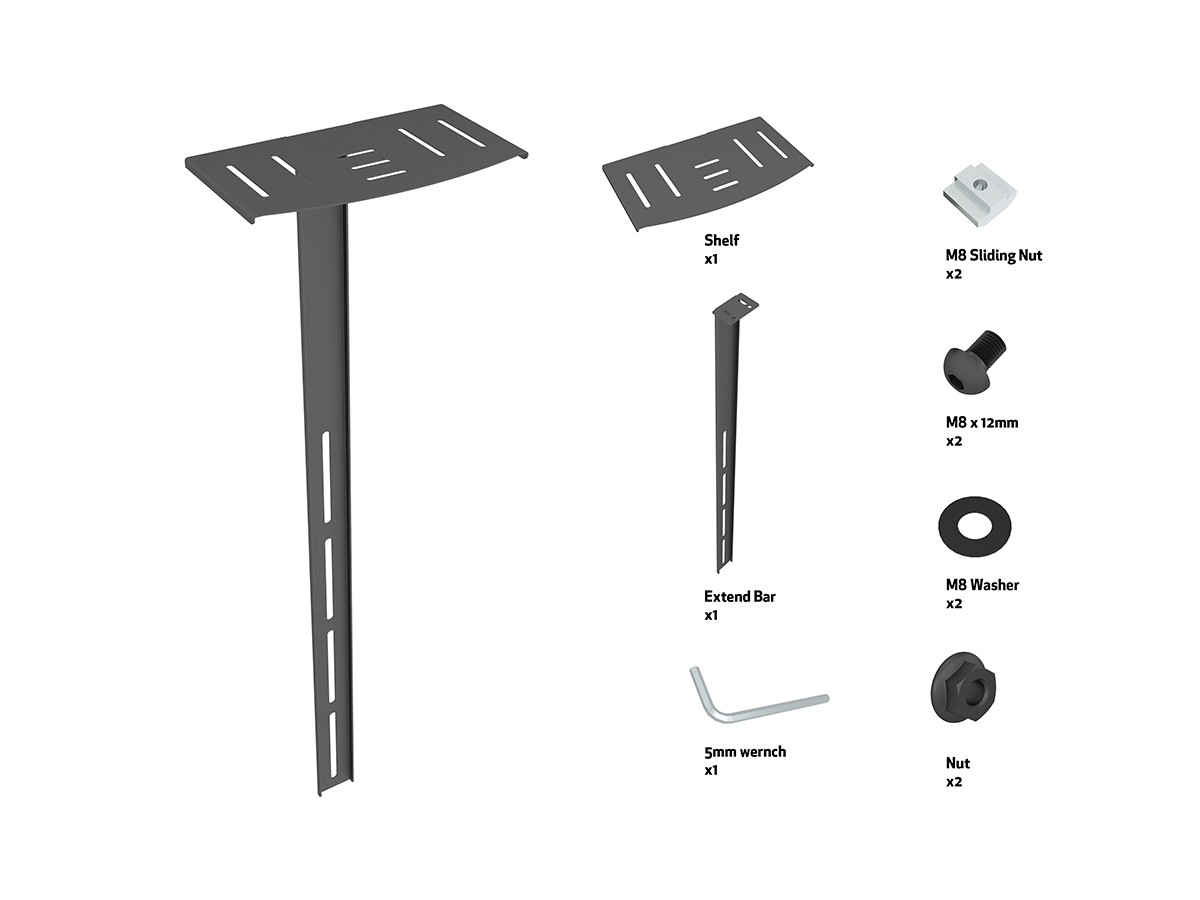 M Universal Camera Holder Large is an optional part to create space for the conference camera of your setup. This video conferencing camera shelf is designed to attach to the railsystem. The shelf provides a height adjustable platform to convert any mount, ceilingmount or stand into a video conference platform.