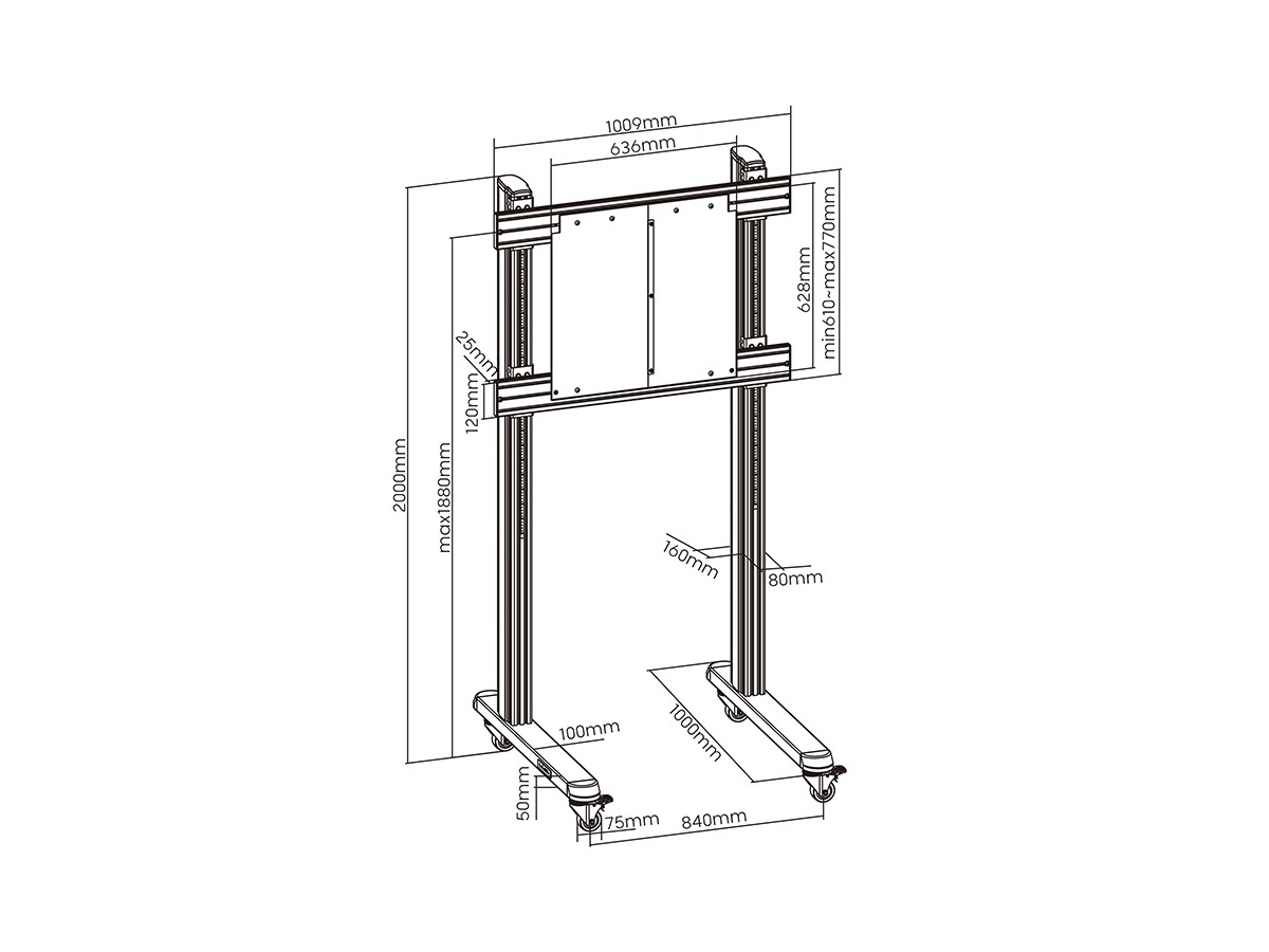 The M Counterbalanced Floorstand is used to mount the M Counterbalanced Wallmount series on a wheelbased floorstand. With the M Counterbalanced Floorstand you can move the display up and down and also roll it around. Move it from room to room. It’s never been this easy to move a large size display or touch screen up and down. Made to fit most public environments and perfect in meeting rooms, and other educational. Introducing the M Counterbalanced Floorstand is designed to provide assisted the lifting force of the M Counterbalanced Wallmount mid-span balancing, allowing safety and usability for any user in front of a large size display and also to move it around. Locakble castors makes it stay in place when the right spot is found.
