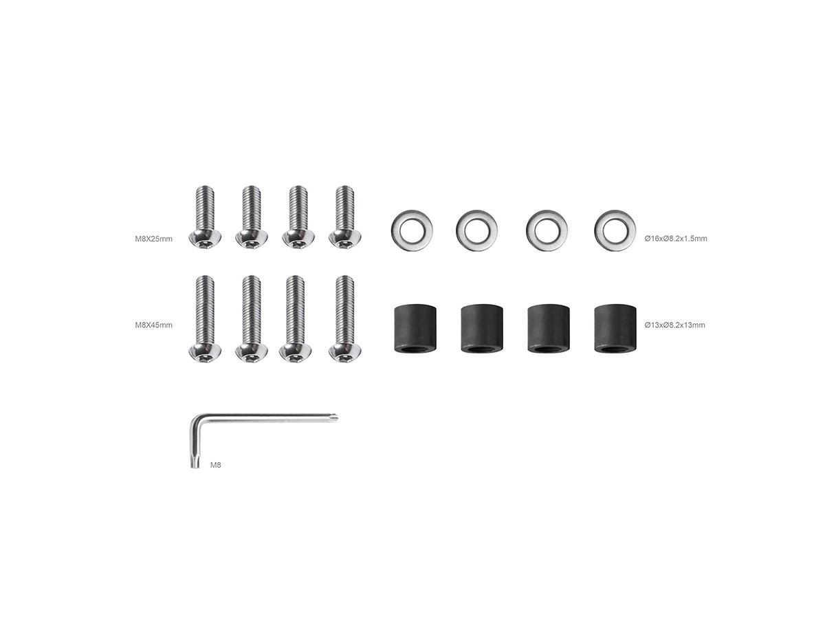 | Included in the package: | 8 screws, 8 spacers, allen key |