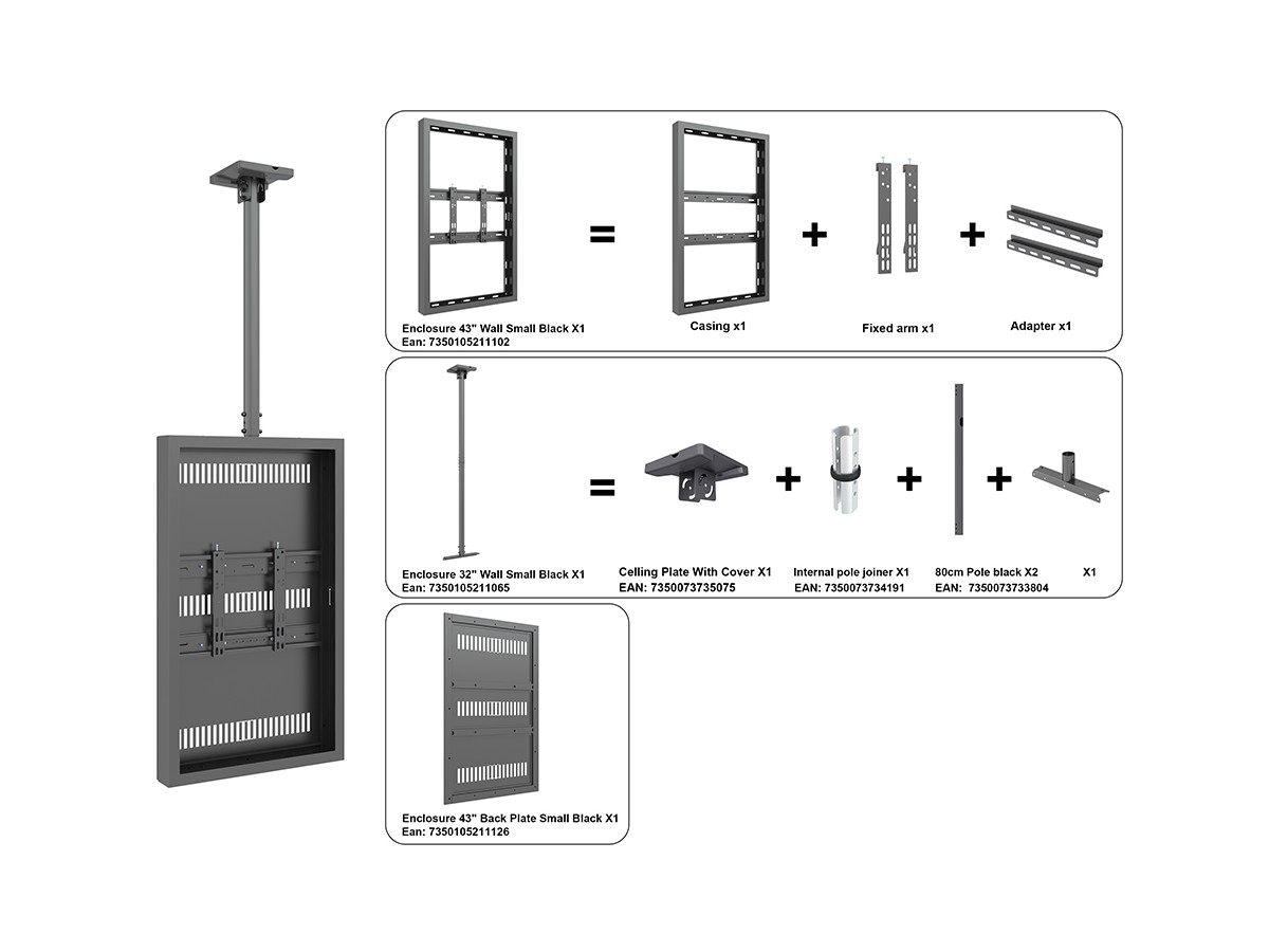 The M Pro Series Enclosure 43" Ceiling Small Black. A well-designed casing /enclosure. Creating a minimalistic look and possible to mount in both Portrait or Landscape position this casing from Multibrackets® is one of the most versatile to date. Choose between screen sizes and colors. The casing includes after adjustment possibilities and can be used for most brands of signage displays on the market. With a smart thermal management, this solution can fit more brands as well as creating thermal management second to none.