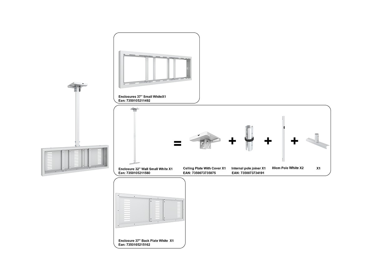 The M Pro Series Enclosure 37" Ceiling Small White. A well-designed casing /enclosure. Creating a minimalistic look and possible to mount in both Portrait or Landscape position this casing from Multibrackets® is one of the most versatile to date. Choose between screen sizes and colors. The casing includes after adjustment possibilities and can be used for most brands of signage displays on the market. With a smart thermal management, this solution can fit more brands as well as creating thermal management second to none.